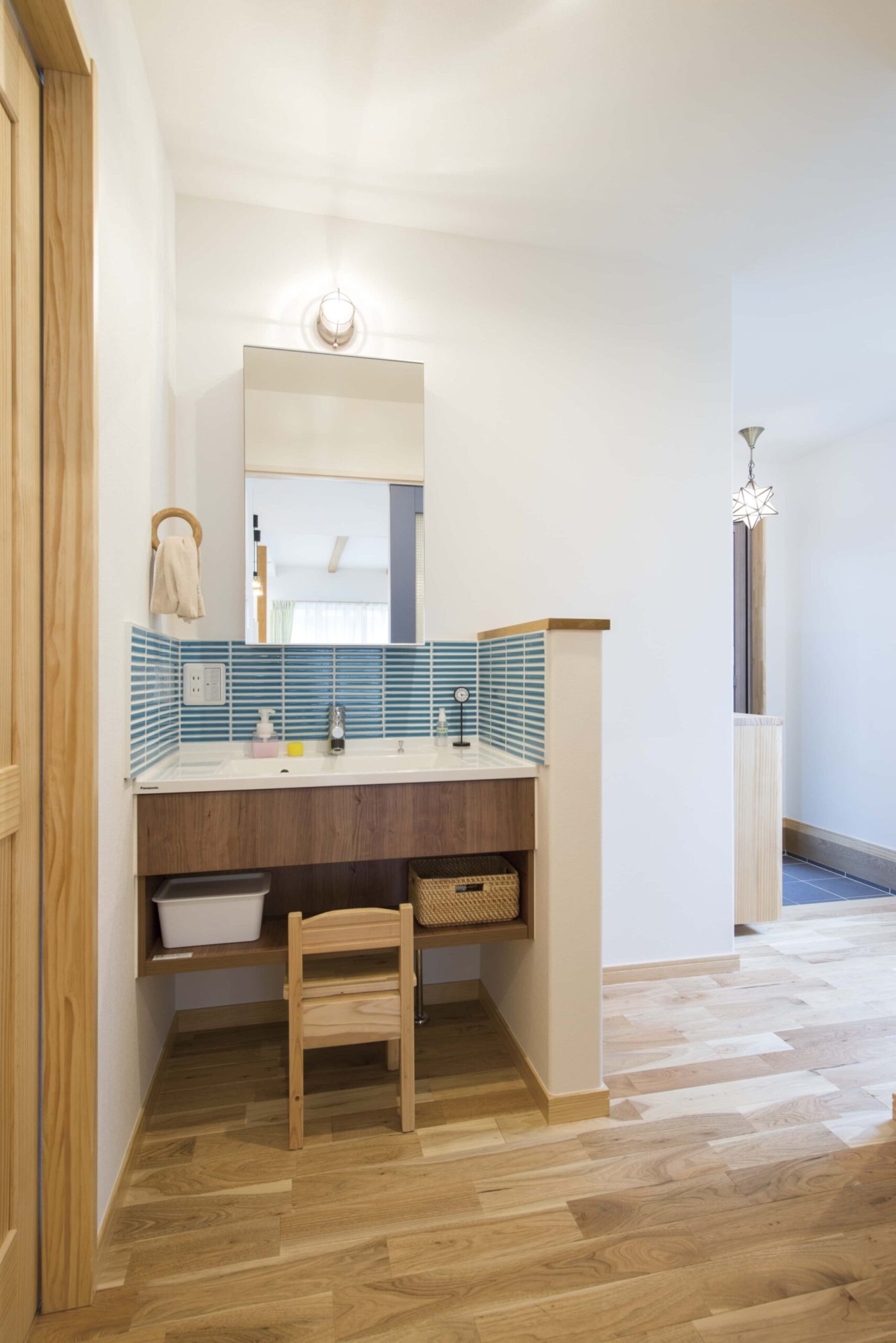 ターコイズカラーのタイルや照明器具・タオル掛けを追加するだけで造作風に仕上がります。