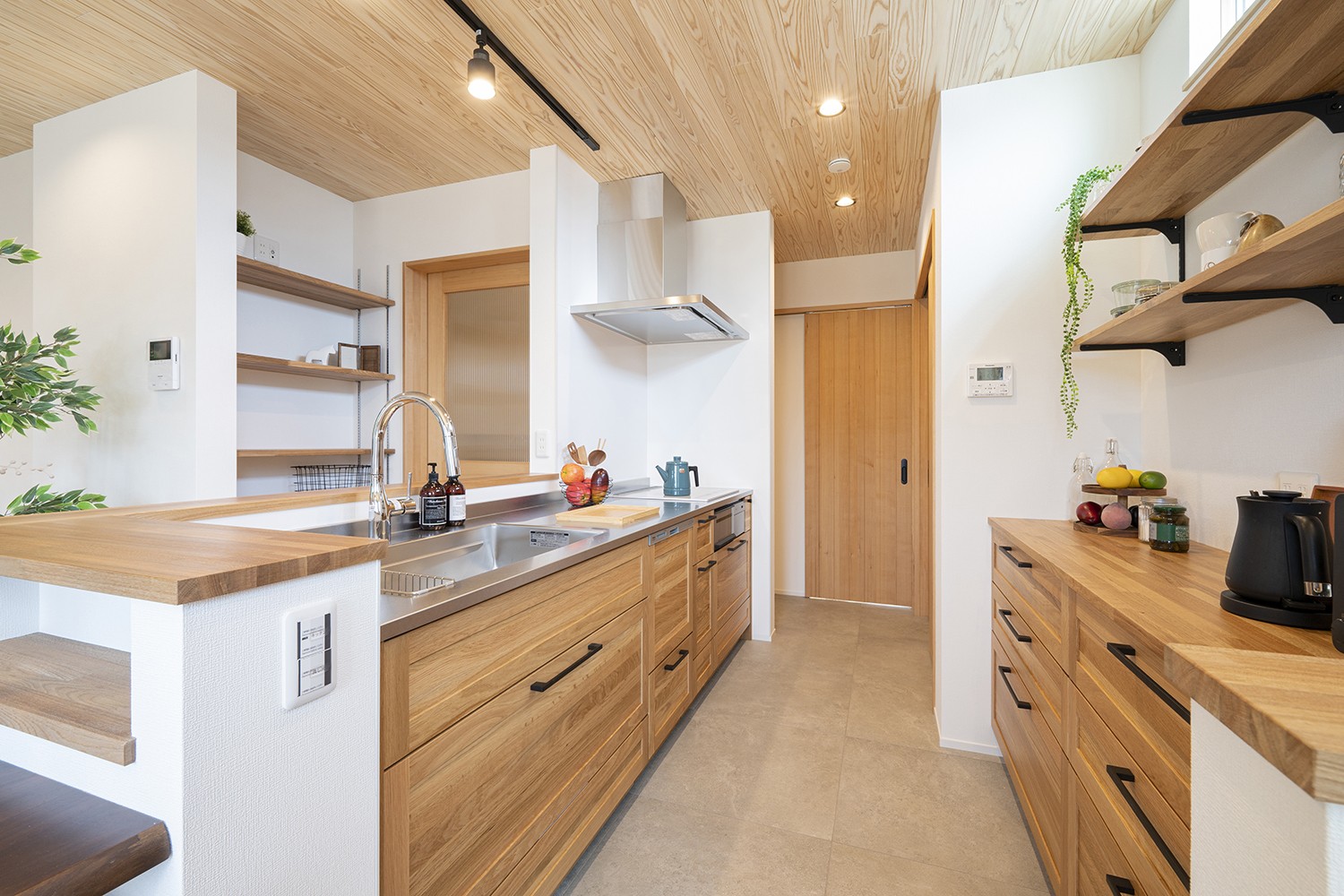 玄関ドアを開けると杉材の香りが広がり、リビングは熊野杉の床、珪藻土の壁、杉板の天井で自然素材に囲まれた心地よい空間を演出します。