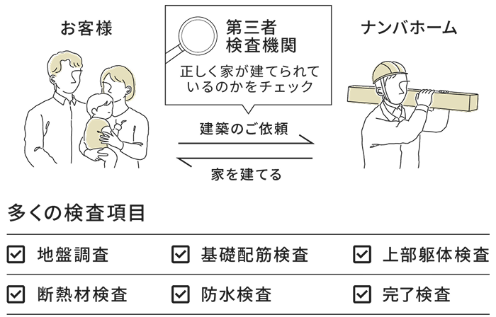 家が正しく、確かに建てられているかを確認するために、地盤・基礎・構造・防水・断熱などを第三者機関が客観的な視点でチェックします。外部のプロによる検査を重ねることで、住まいの安心と品質を確かなものにします。