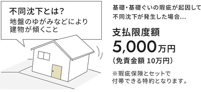 もし地盤のゆがみなどで建物が傾く「不同沈下」が発生した場合でも、最大5,000万円まで補償する体制を整えています。万一のときも安心が続く住まいをお守りします。