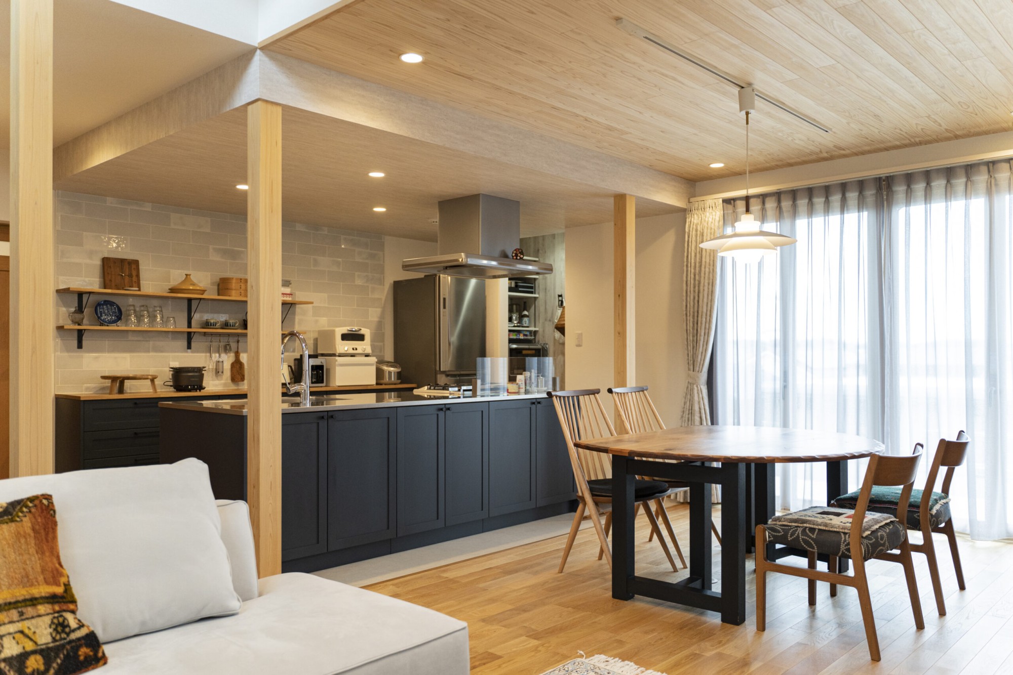 どこを見ても木が感じられ、タイルを張ったカフェ風なリビング。
