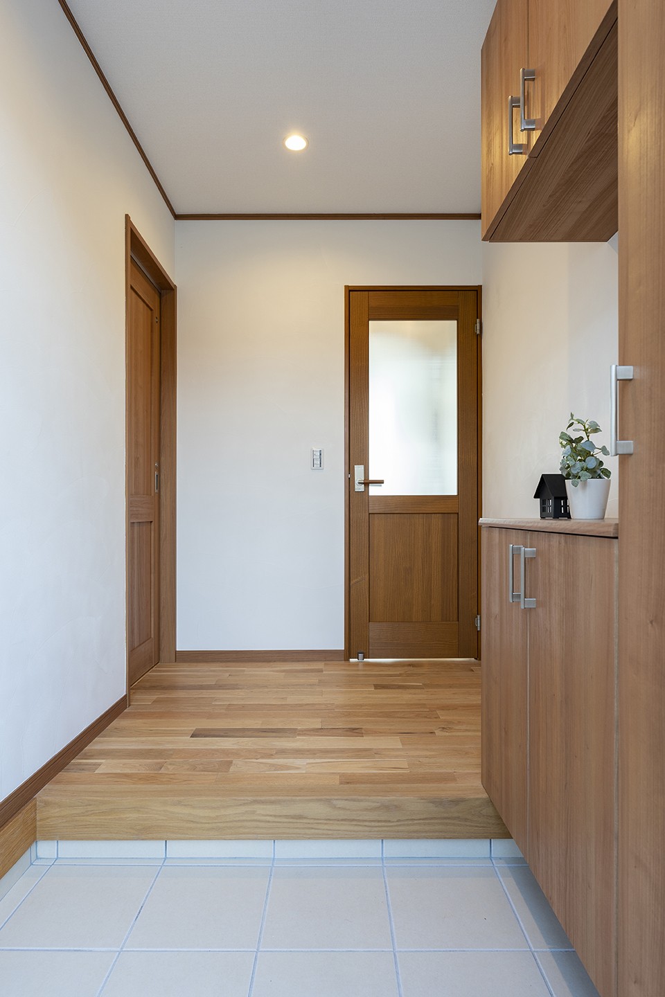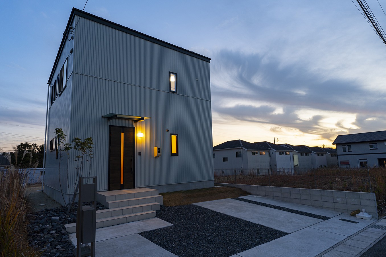 木の床と漆喰塗りで仕上げたシンプルな箱のお家。ただいま~と帰ると気持ちの良い空気がお出迎えをしてくれる住まいです。外壁にもシンプルデザインなガルバリウム鋼板を使いました。