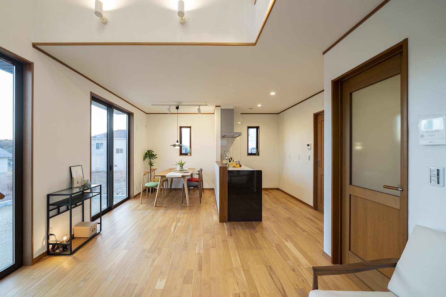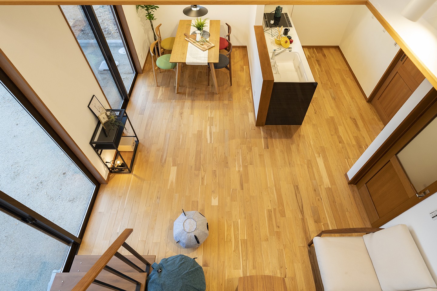 床はウォルナット、壁は漆喰塗りで仕上げたリビング。コンパクトながらも無駄のない間取りにしました。