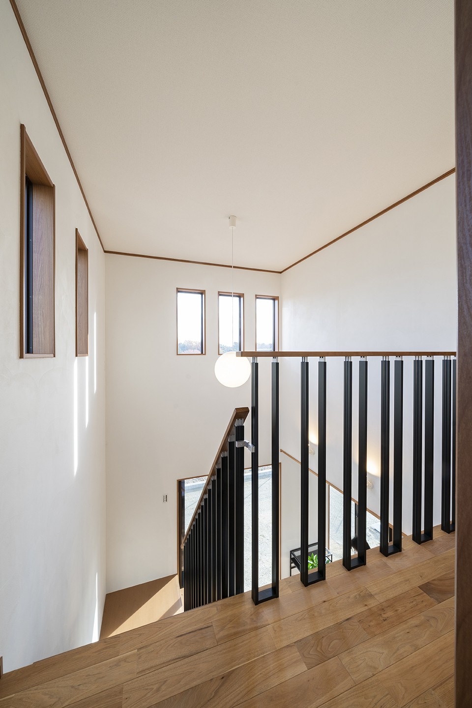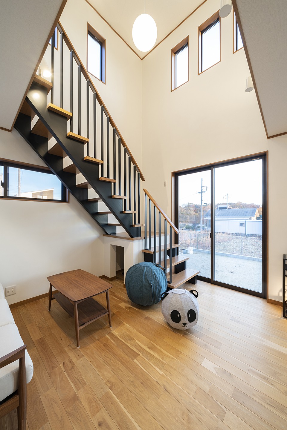 リビングにある吹き抜けは明るさと解放感を与えてくれます。黒のアイアンと木でできた階段がこのお家のインテリアアクセントになっています。