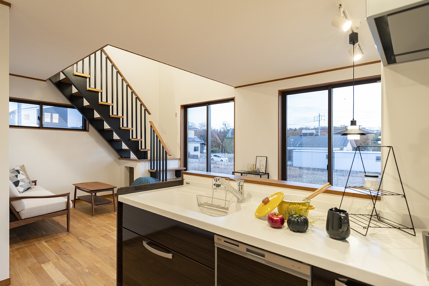 使い勝手のよい対面型キッチンからはリビングや外を眺める配置にしました。