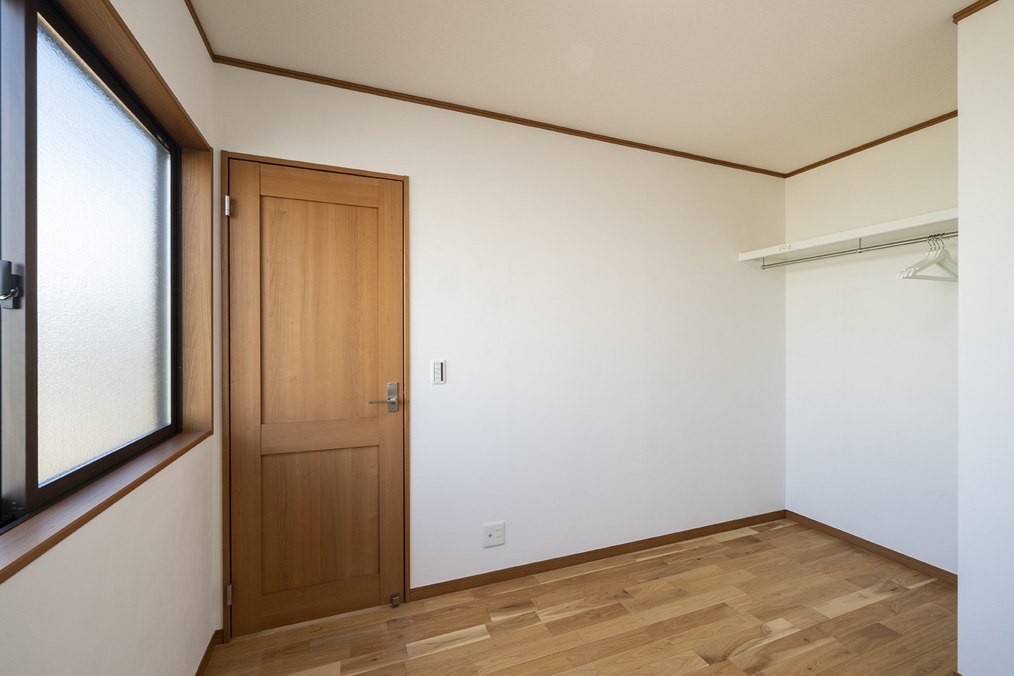 2階の子ども部屋にもウォルナットの木の床を使っています。オープンクローゼットも無駄のないスペースとして活用されています。