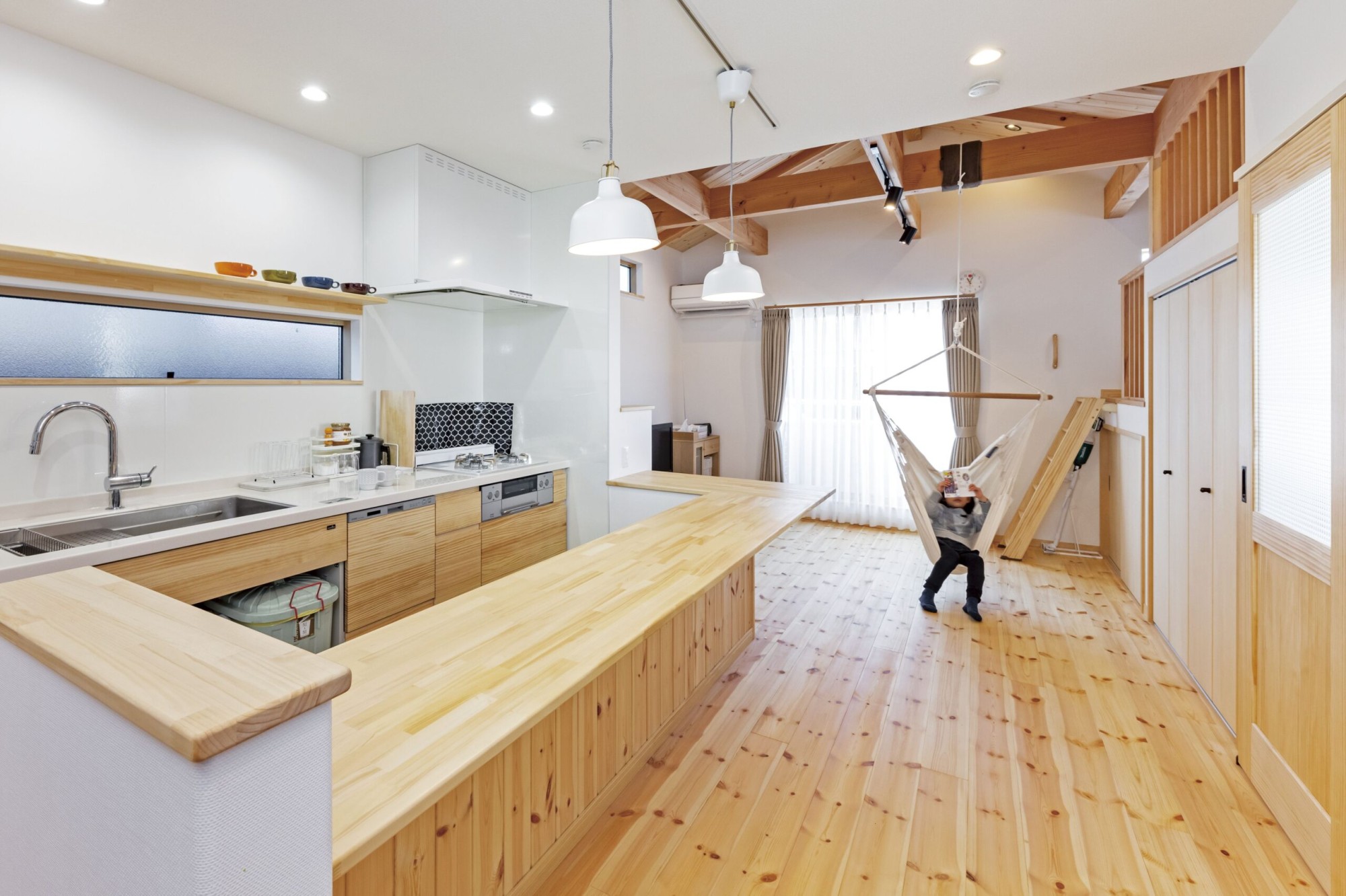 梁にハンモックをぶら下げて、お家は遊び場・リラックス空間。