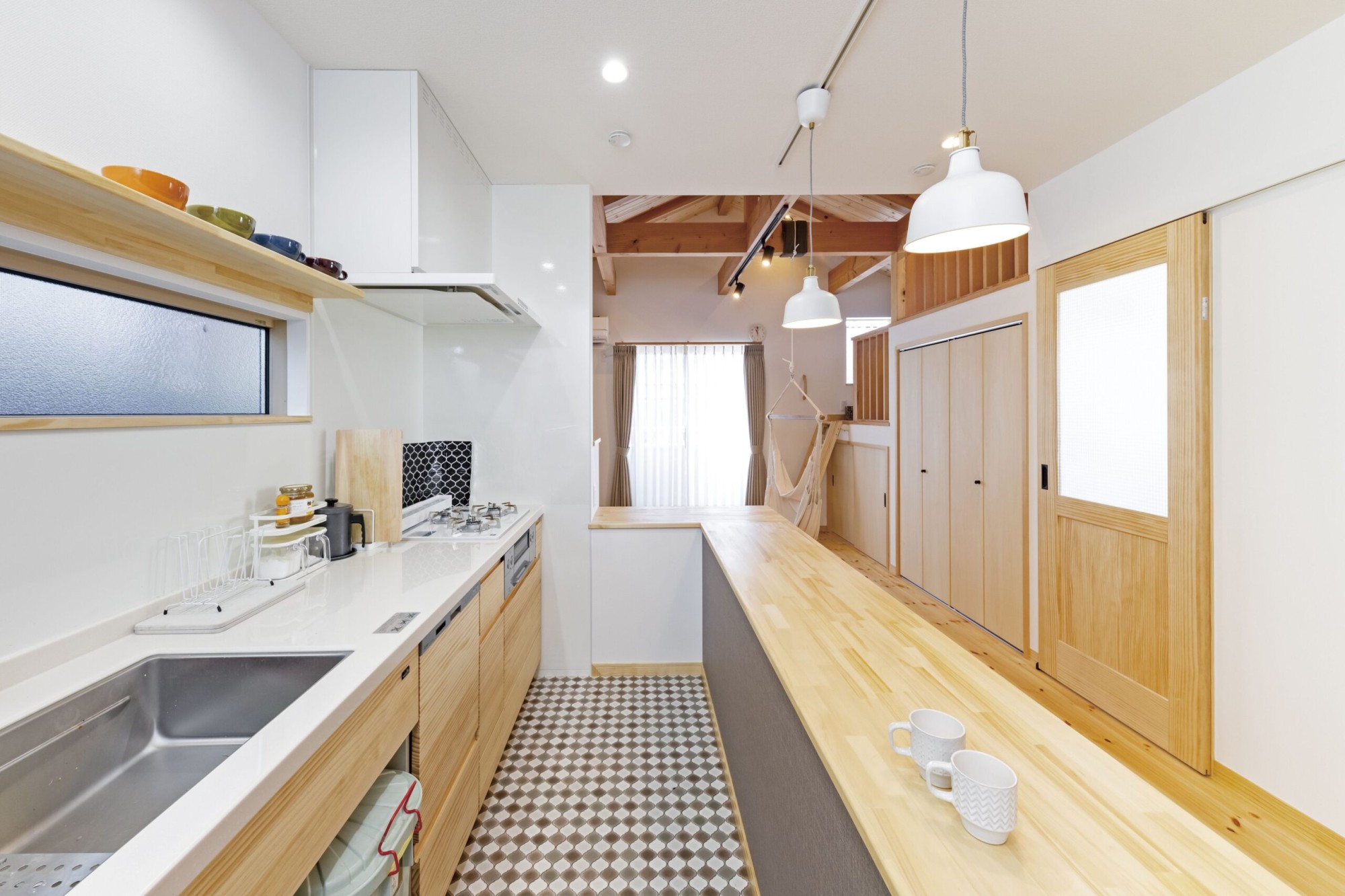 かわいいがコンセプトの、白と木を基調にしたキッチン。