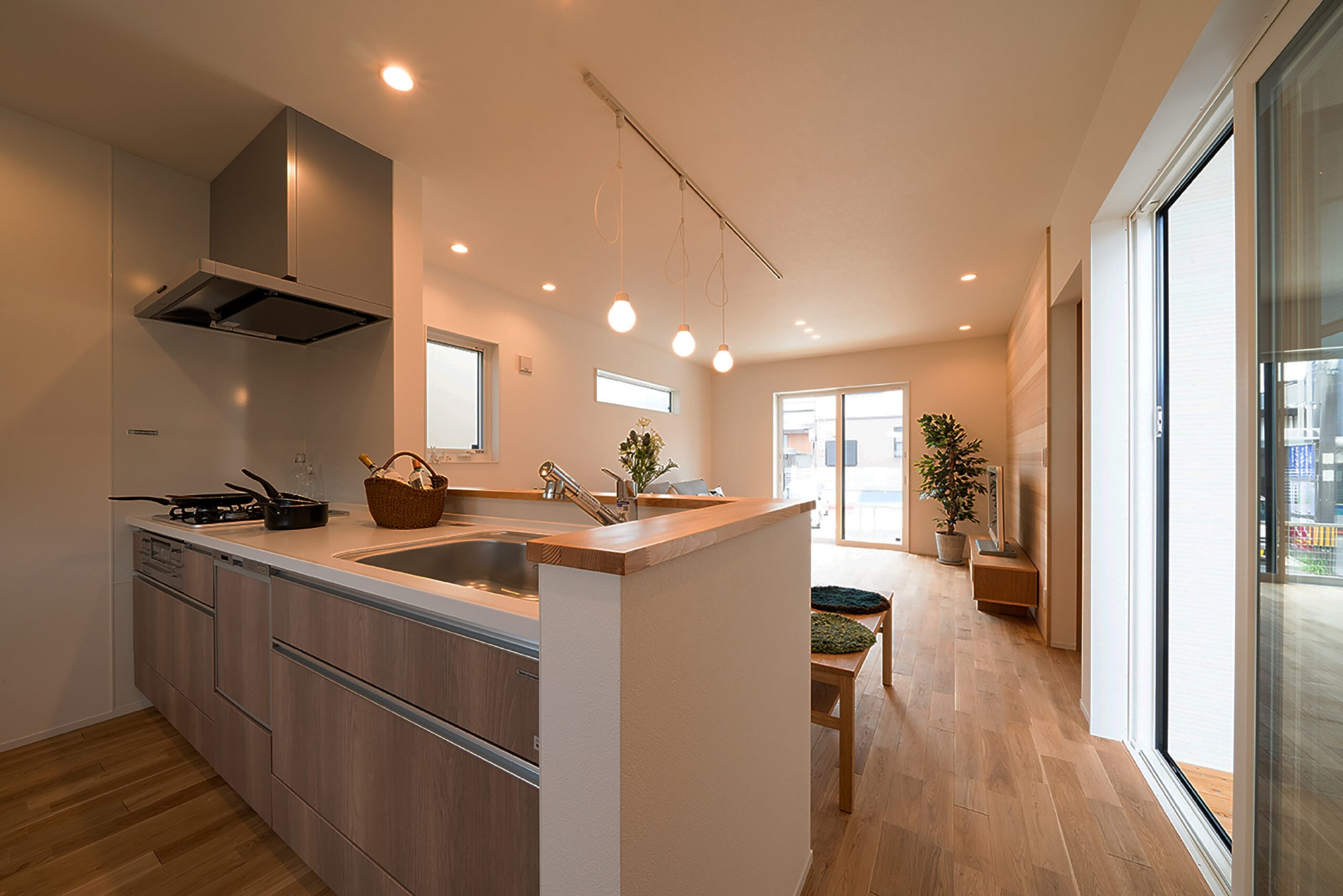 キッチンは床のオークの落ち着きのある中間色に合わせた色合いでインテリア性も抜群です。