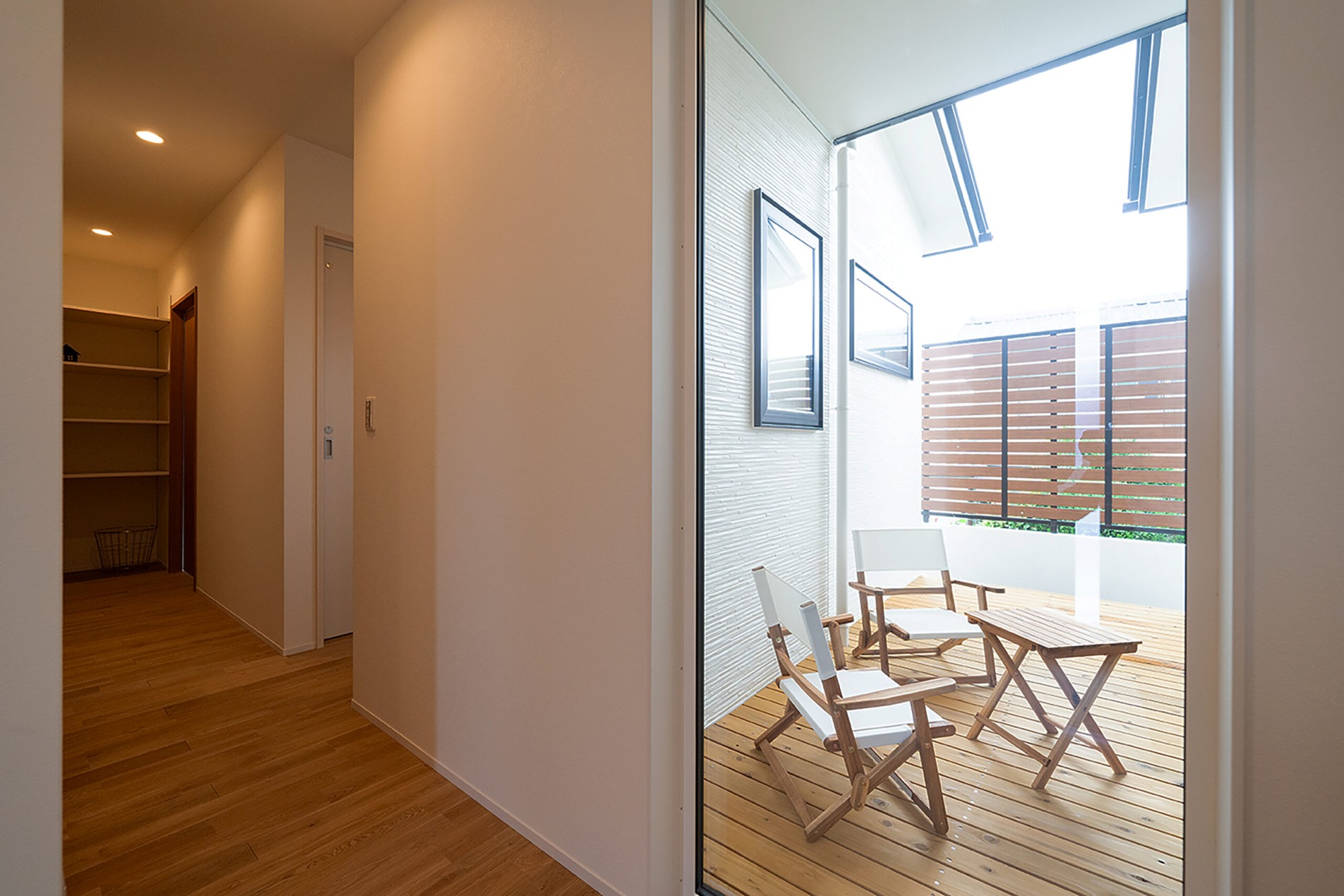 玄関前に大きな窓ガラスを設置する事により自然の光を取り入れました。