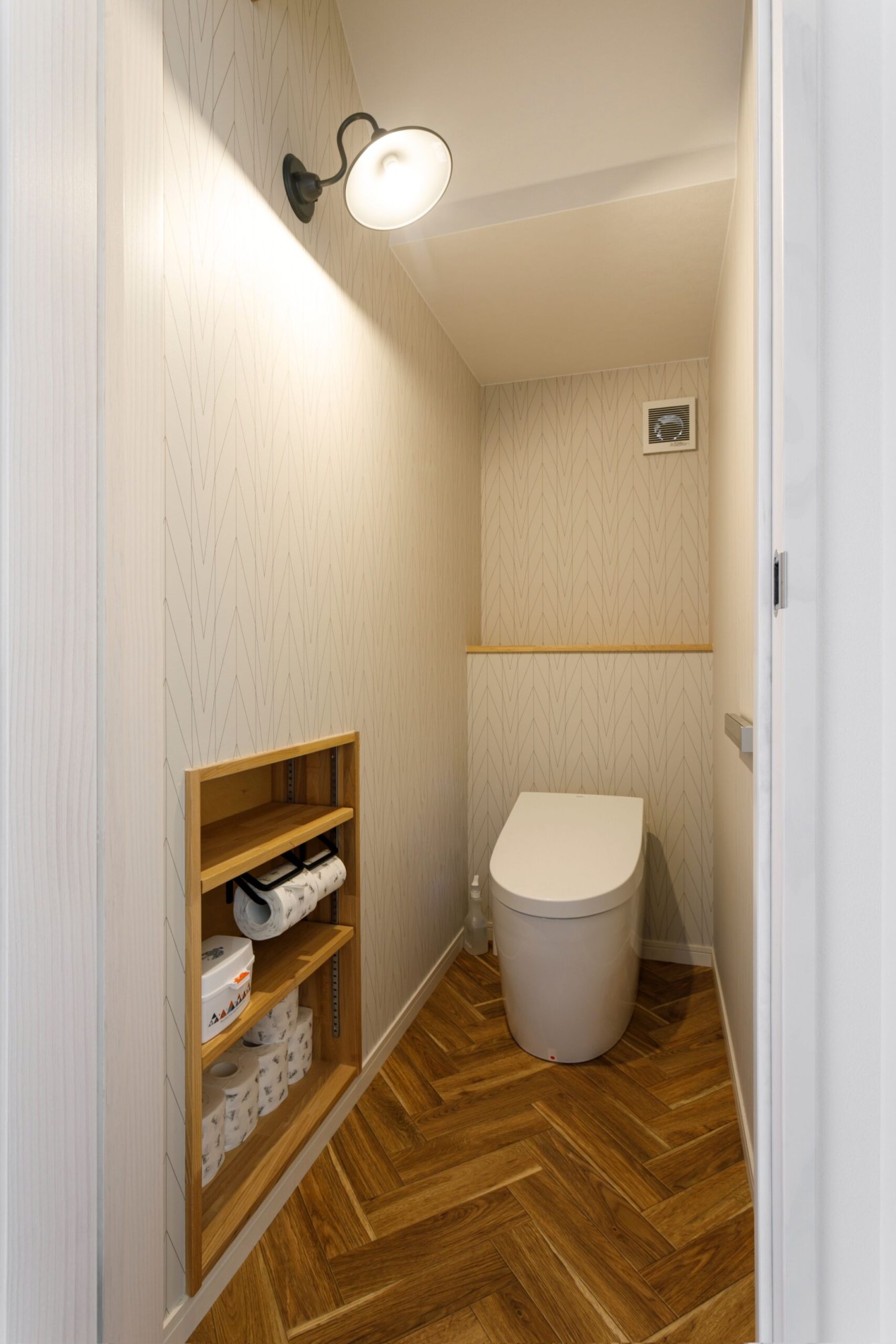 造作の棚のおかげで、床に置くものがないおトイレ。シンプルかつ、お掃除も楽々です。