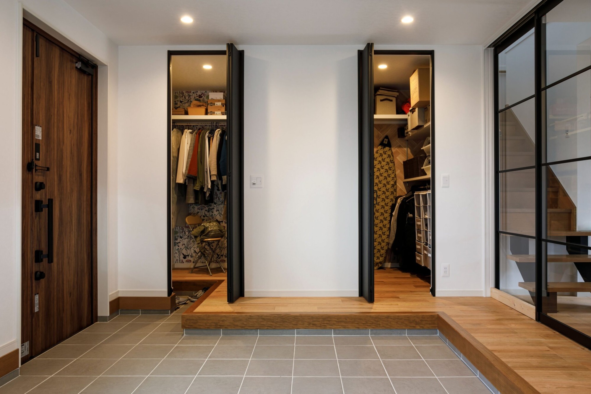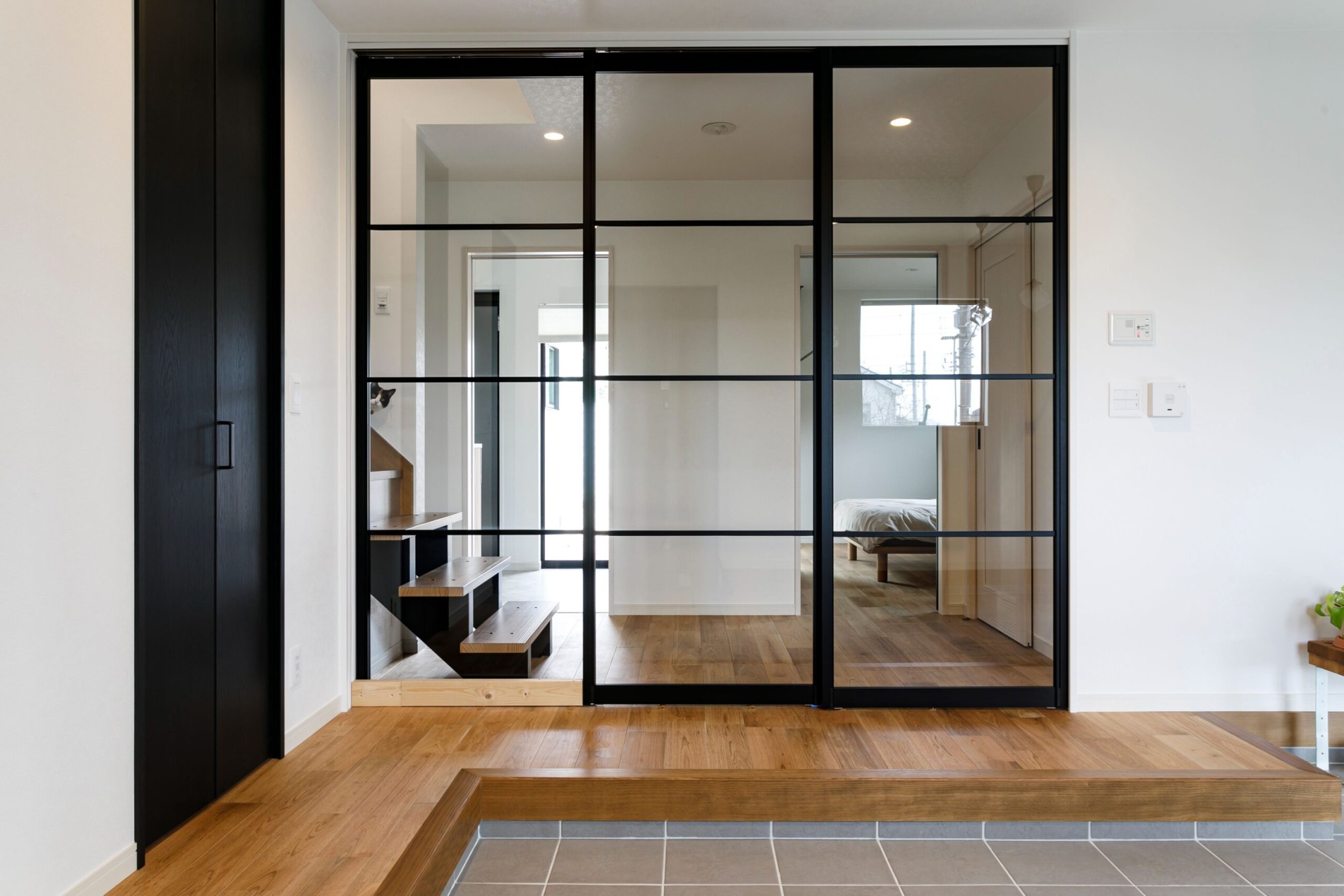 玄関は黒をアクセントにした窓・扉、そしてウォルナットの色濃い床材が高級感とかっこ良さと演出しています。