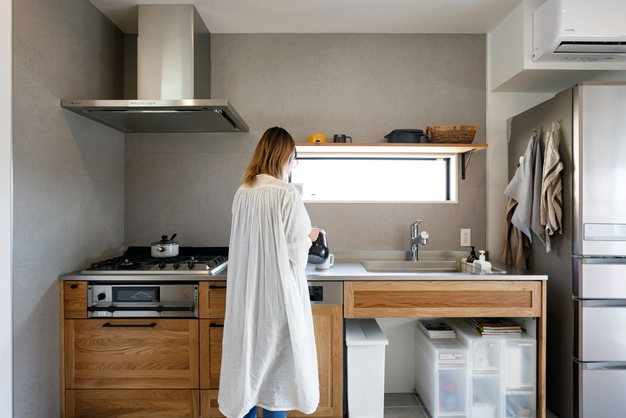 木目のキッチンとグレーが調和して、自然を感じられるモダンな風合いを引き出しています。