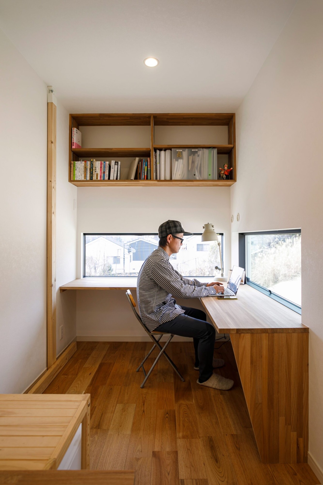 壁を向いて作業する、閉鎖的な空間になりがちなスタディカウンターも窓のおかげで光射す解放的空間に!