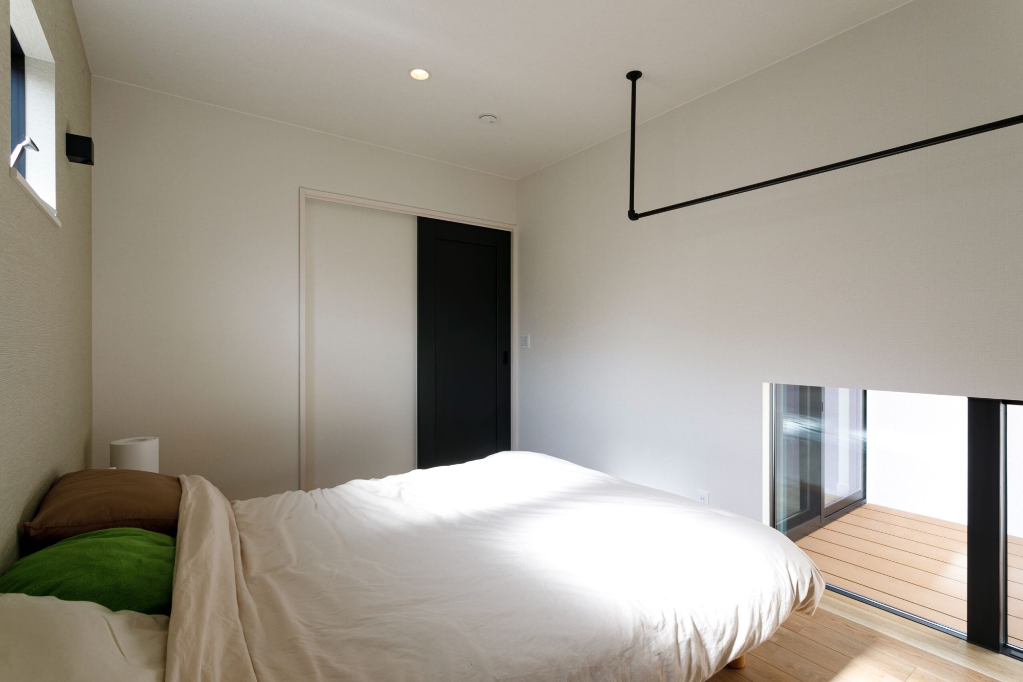 寝室は、太陽の日差しが目覚ましになる窓付きのお部屋。ポールは、寒い冬に着た上着・暑い夏に使うタオルケットなどがかけられ、かつお部屋のアクセントにもなっています。
