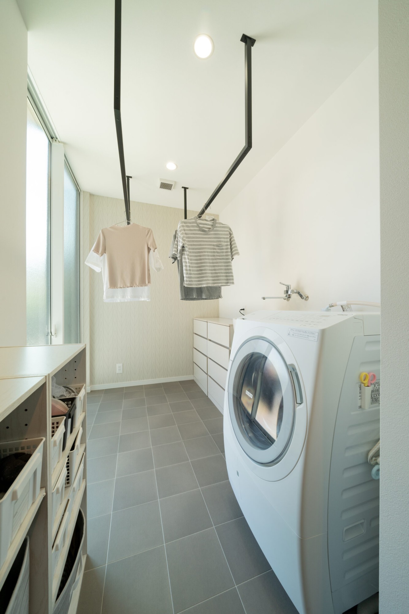 家事の工夫はここにも。洗濯後、干して収納できるランドリースペースも設けています。