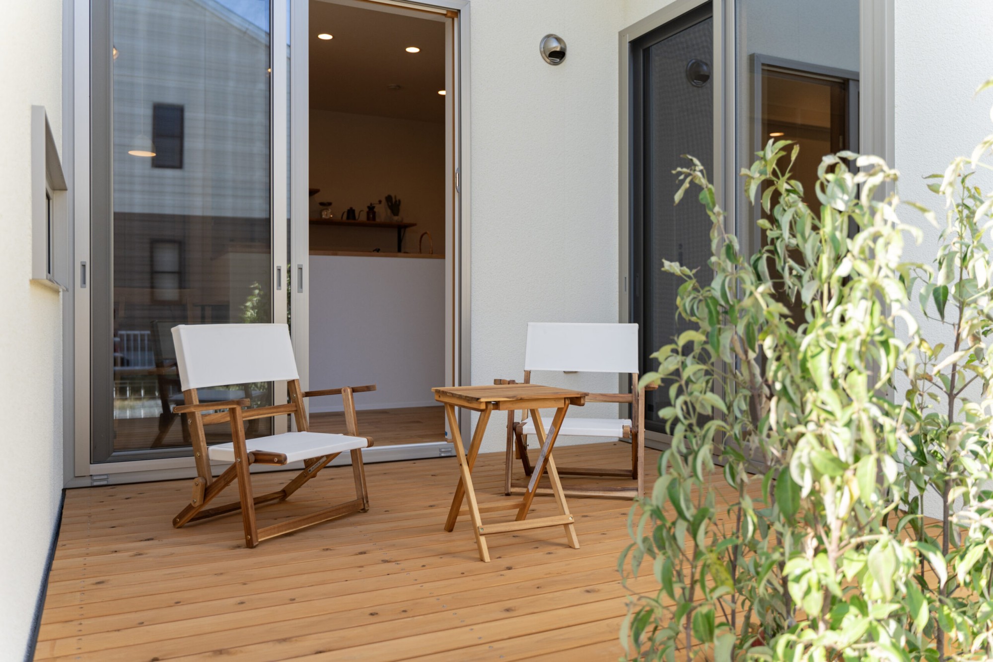 白色のスタッコフレックス×木の色合いに軒を出すスタイルで和モダンな印象の外観に。