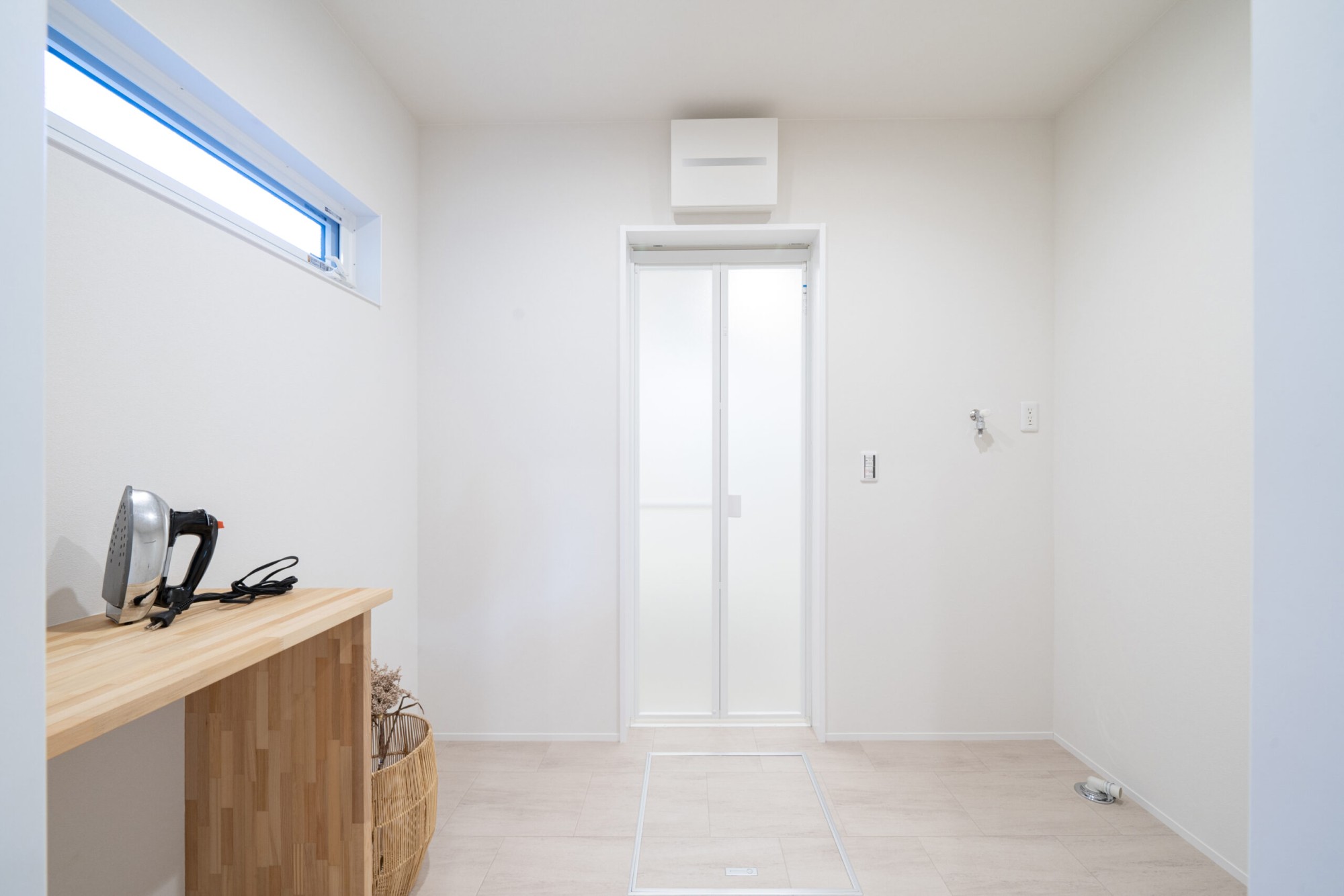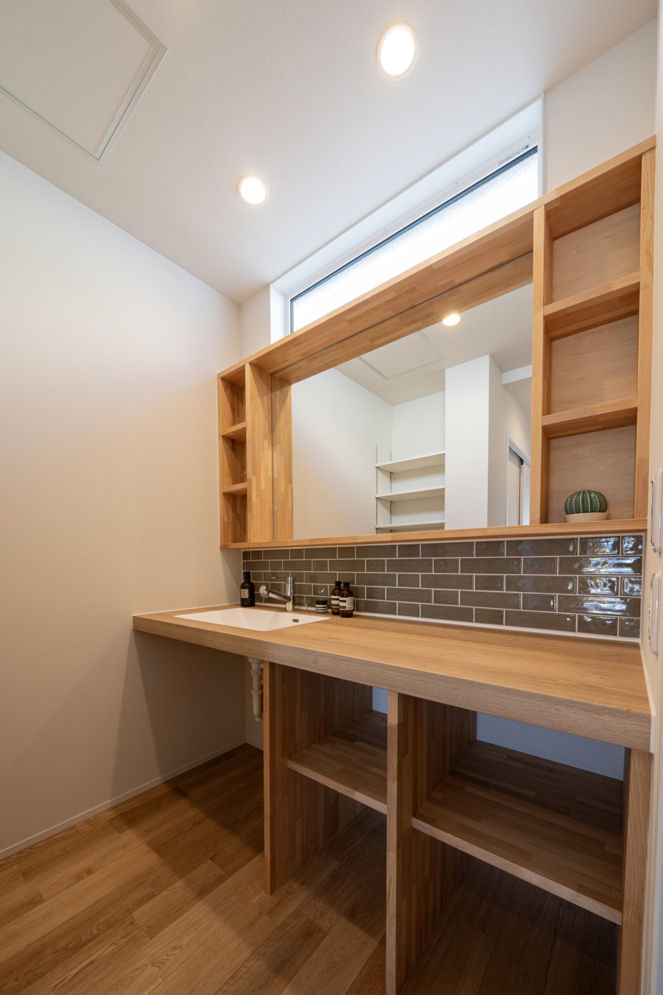 廊下の先には造作洗面台を設置。暗くなりがちな洗面台も上部に窓を設置し採光を取り入れる工夫をしています。