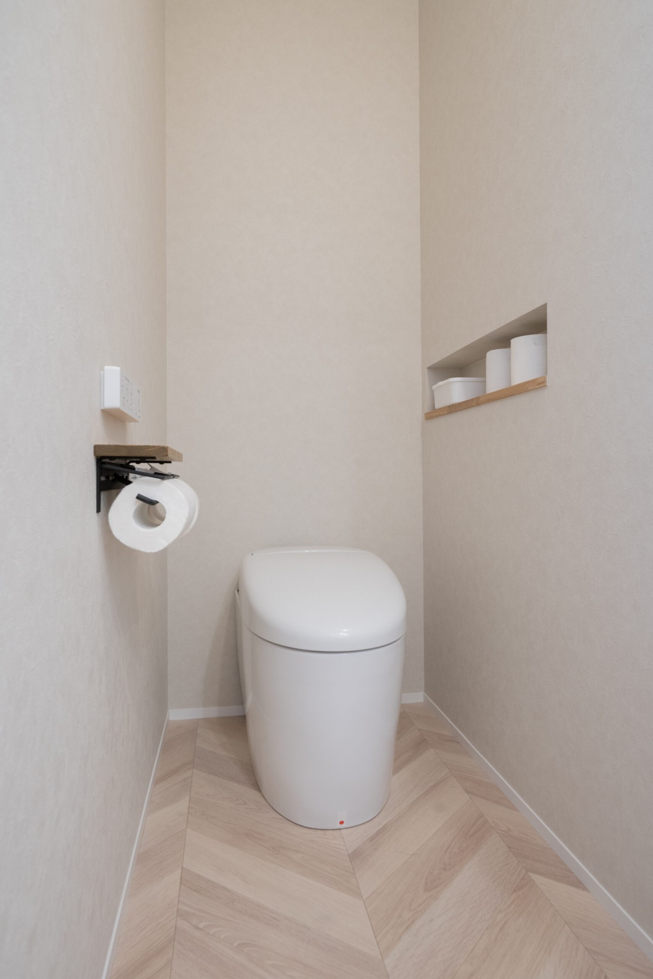 トイレはタンクレスのものを使用し、すっきりとシンプルに。ニッチに収納することでスペースを確保しています。
