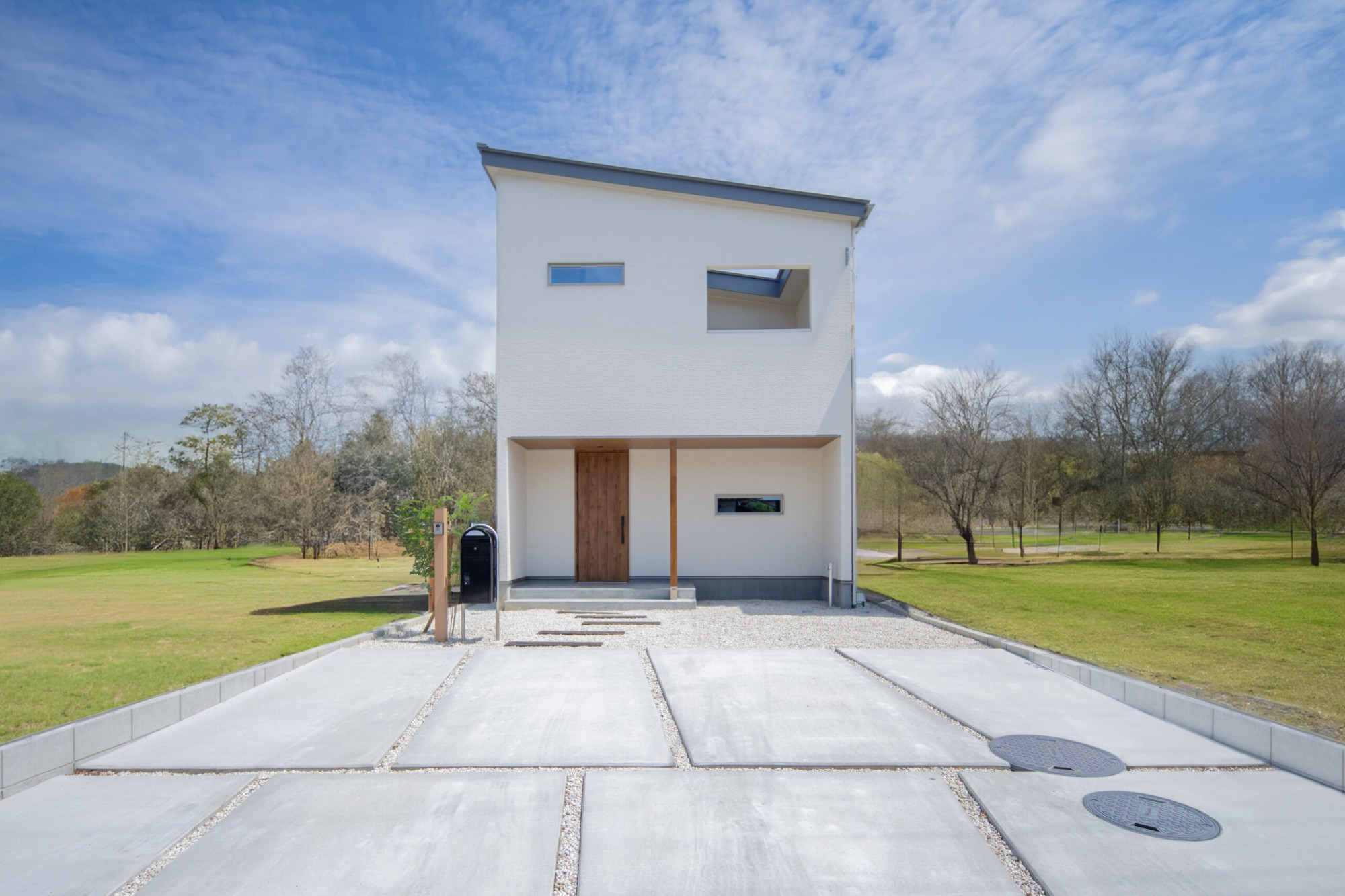 白色の外壁に扉と柱の木目が映えます。