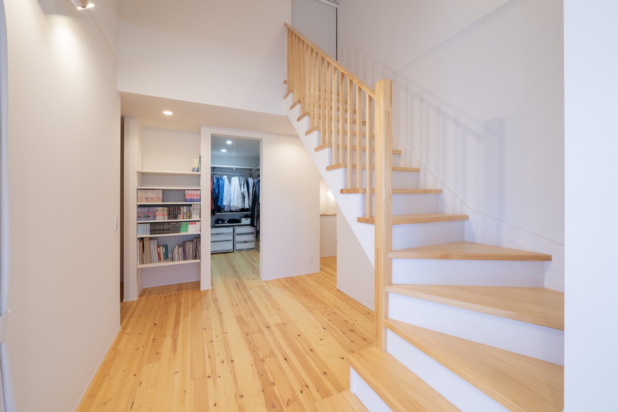 小屋裏収納に繋がる階段。奥には4.3帖のファミリークロークがあります。また、入り口横のスペースを活かして収納できる可動棚を取り付けました。