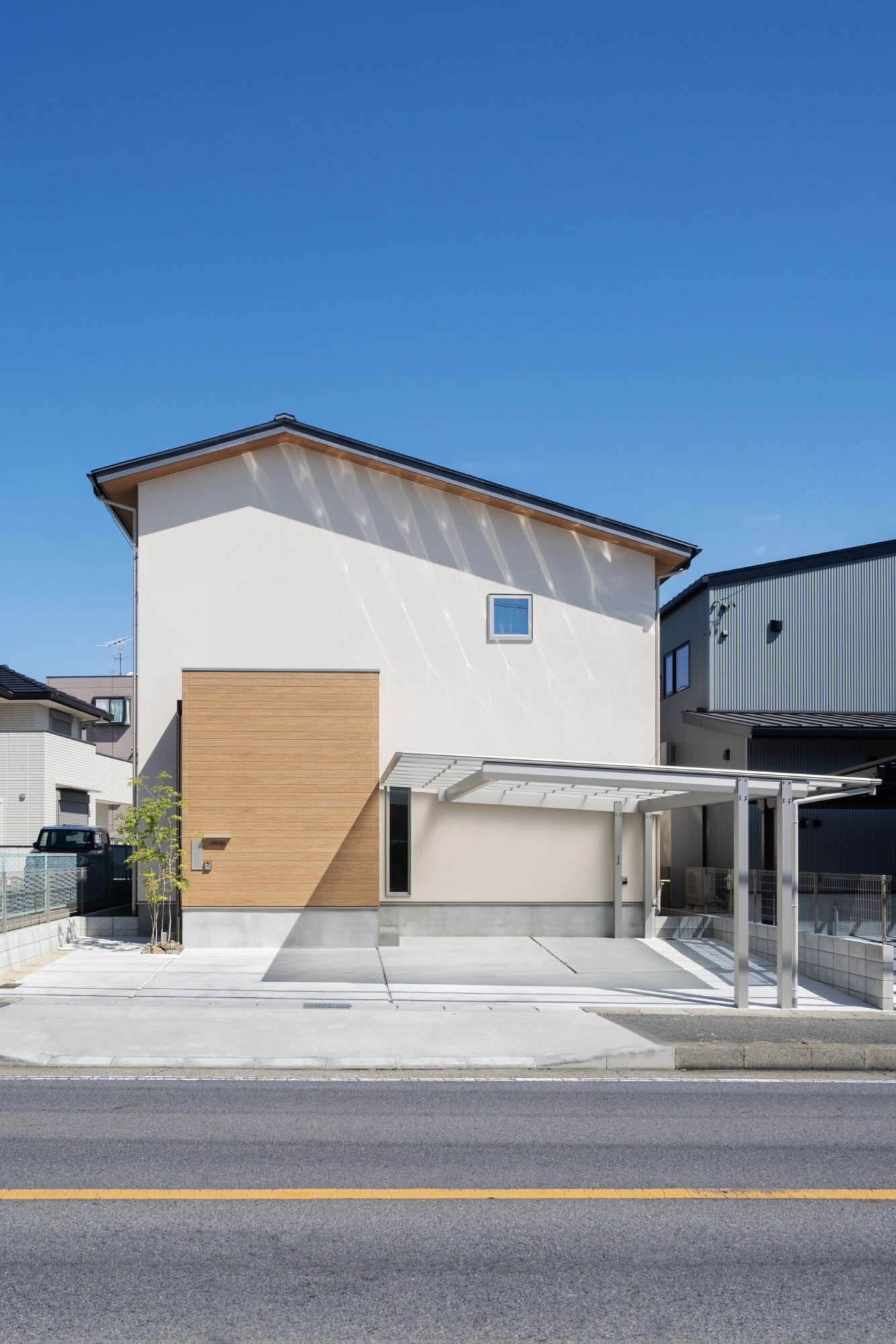 白いスタッコフレックスの外壁に木目が映えるナチュラルな外観のお家です。