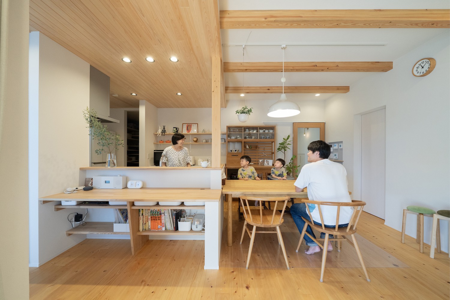 柱、床、天井はヒノキ、梁はベイマツ、カウンターはタモ、全て本物の木が使われています。