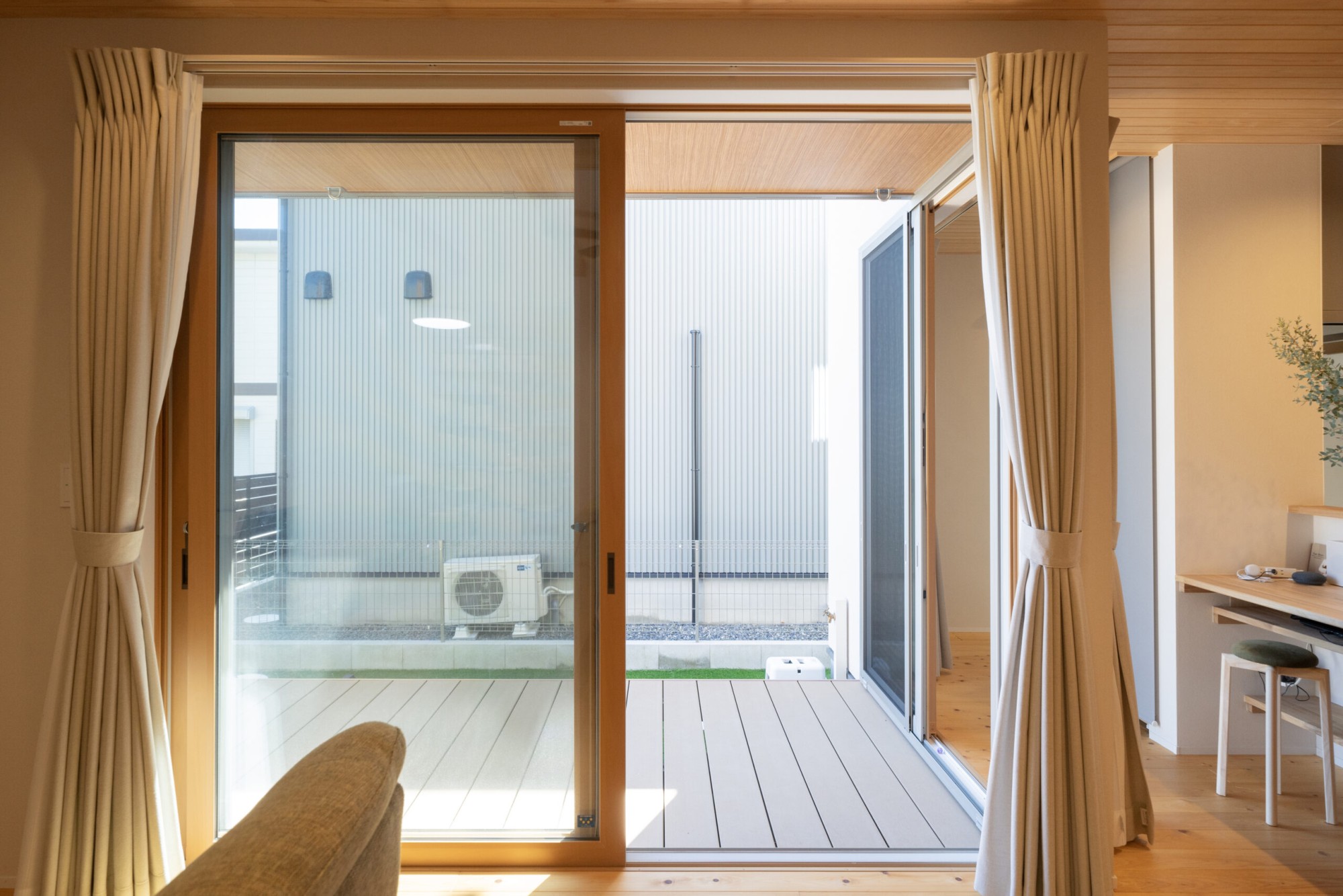 リビング側からもダイニング側からもウッドデッキに出ることができます。家族みんなでBBQをしたり、お子様がプールで遊んだり、様々な楽しみ方ができます。