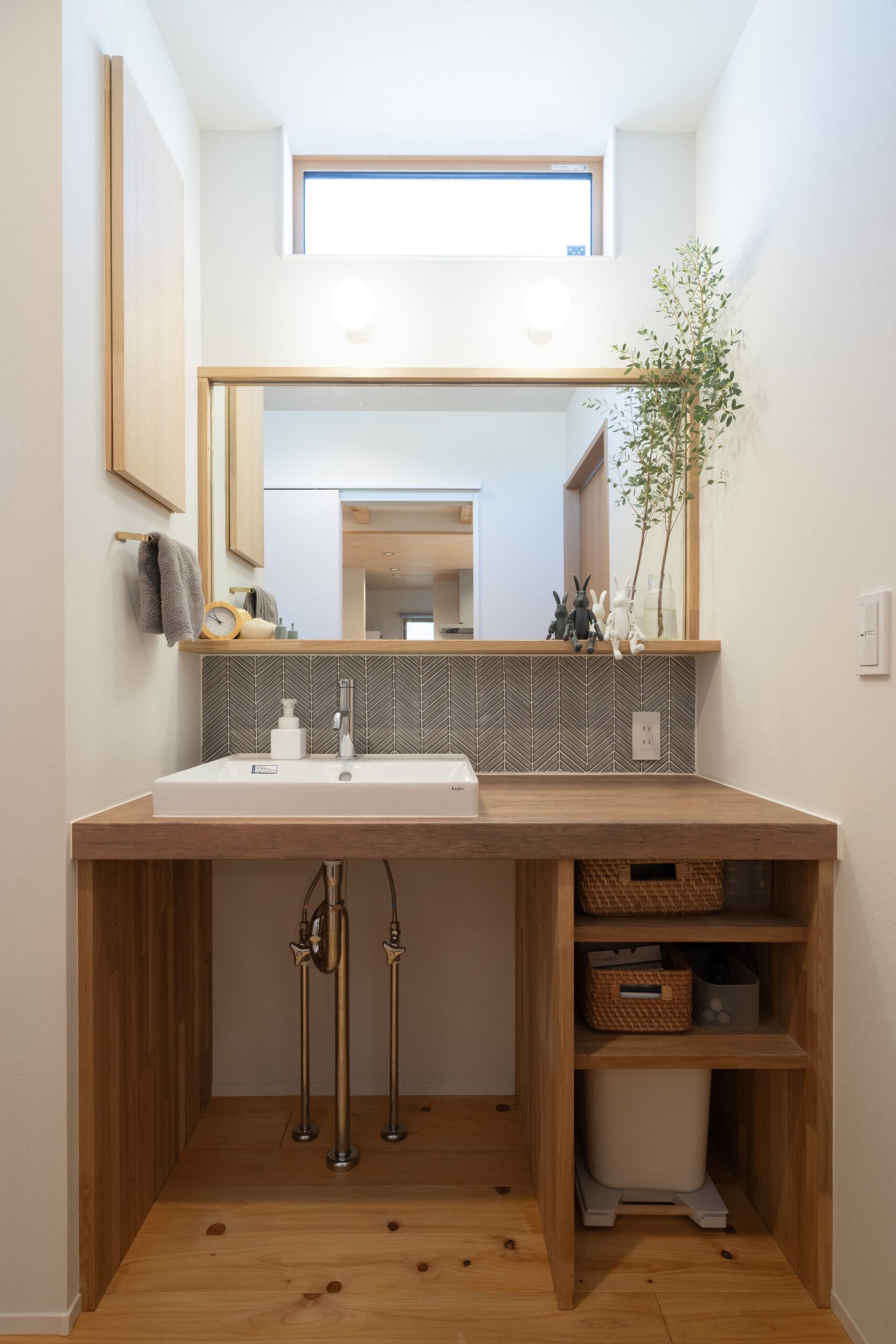 独立型の造作洗面台です。しっかりと採光を取り入れる窓、2人並んでもゆったり使える広々スペースです。