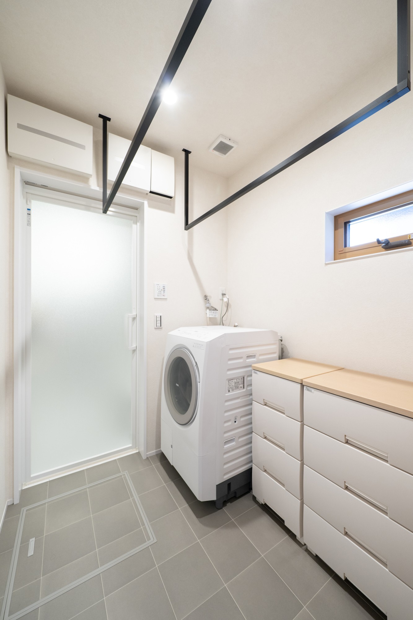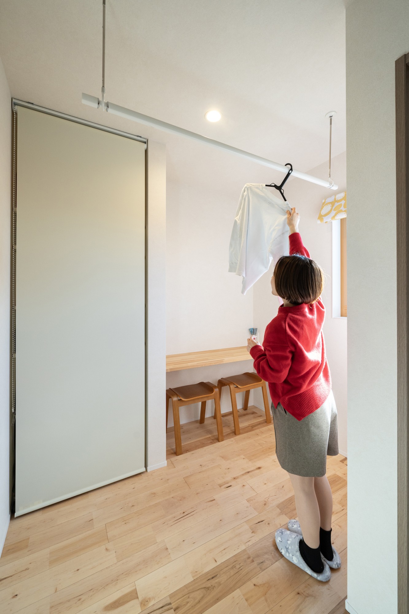 脱衣室兼ランドリールーム。洗濯して、その場で干して、畳んでしまうまでが完結する空間になっています!