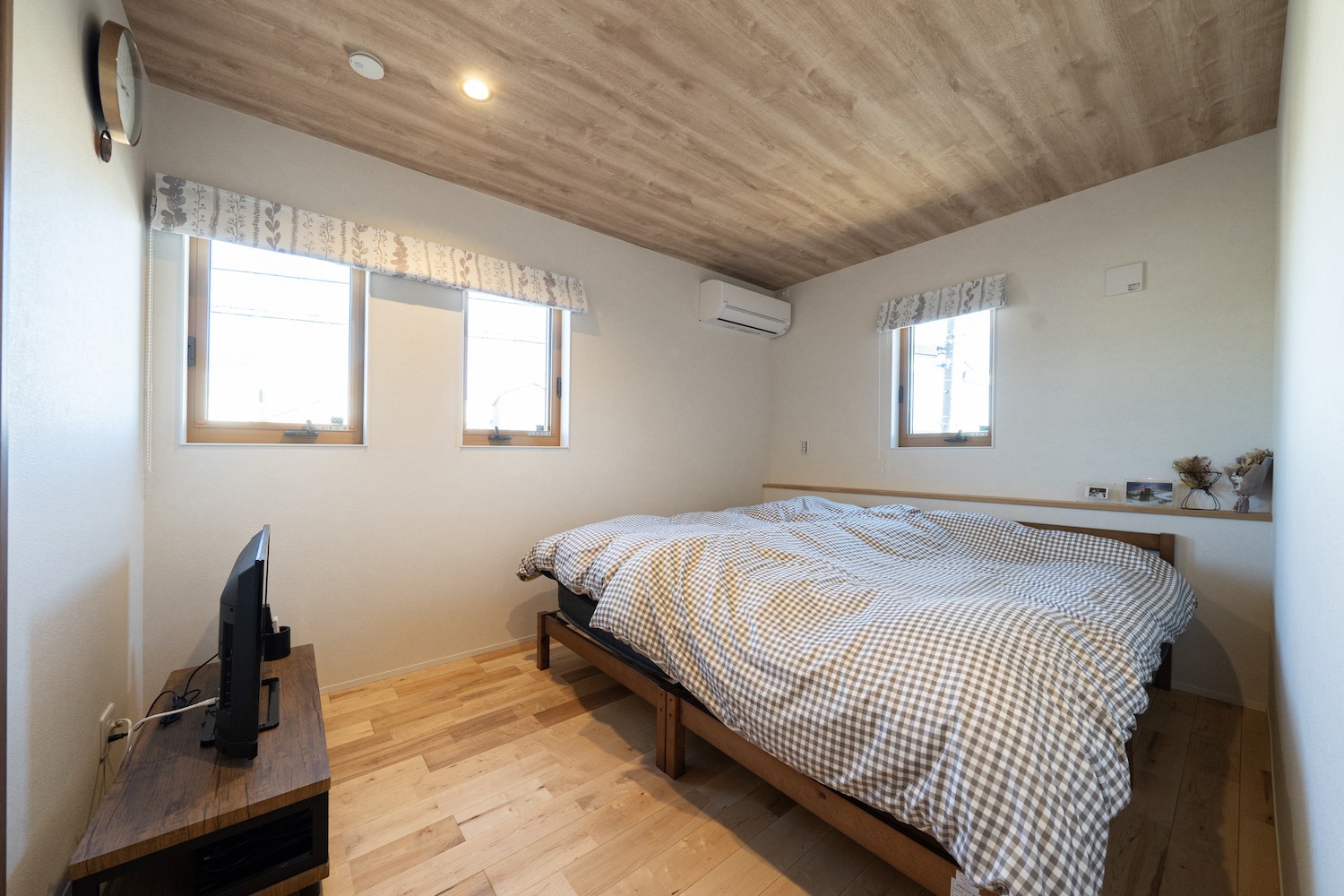6帖の寝室。ベッド周りは意外と物が溢れがちですが、造作を用いて枕元に物を置けるスペースを作りました◎