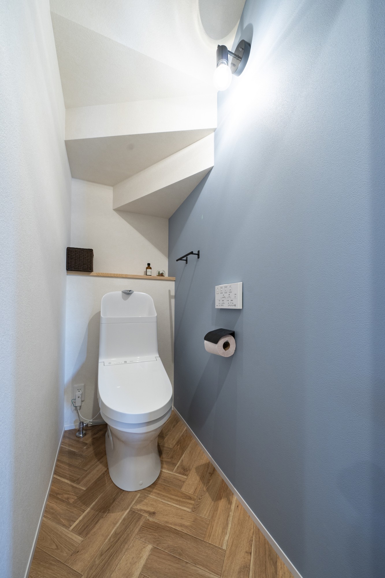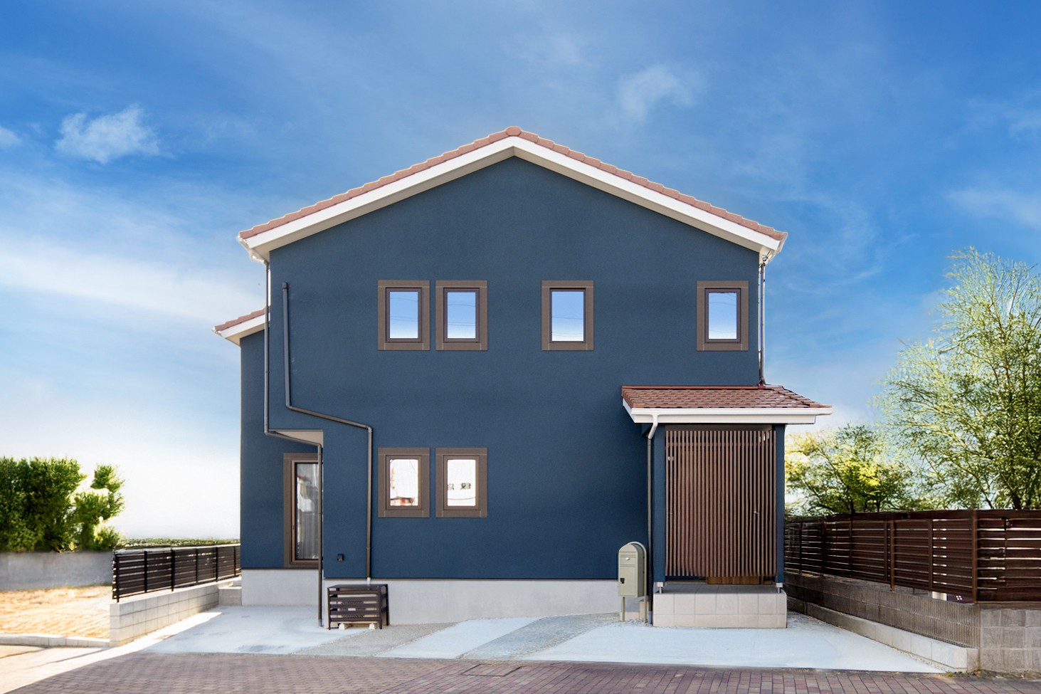 ネイビー×ブラウンの洋風な外観がおしゃれなお家。アーチの垂れ壁やカラードアなどかわいらしい内装です。
