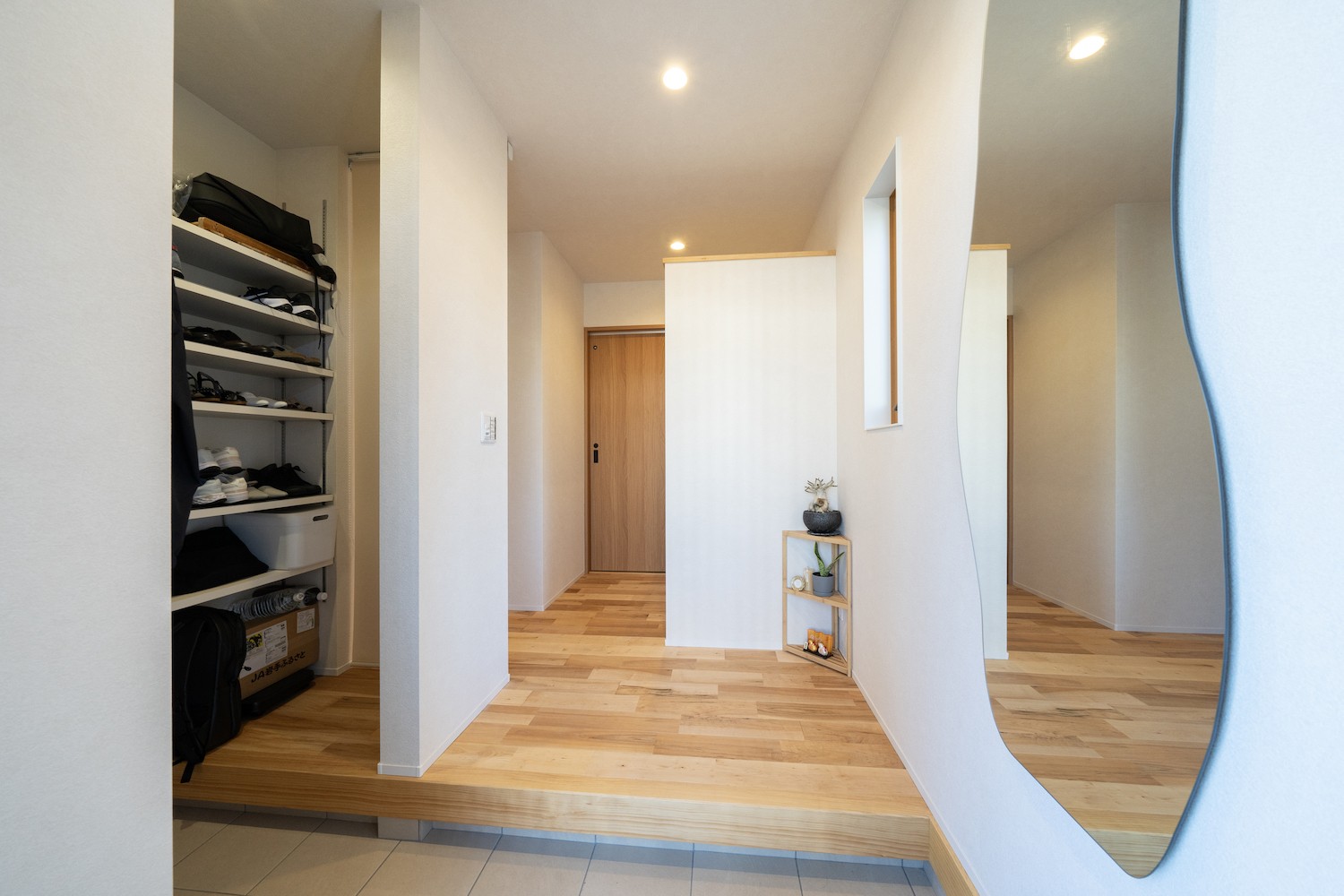 玄関からホールへは2か所から上がることができます。収納は隠しつつ、玄関から直接アクセスができるので、片づけやすく取り出しやすい収納スペースです◎
