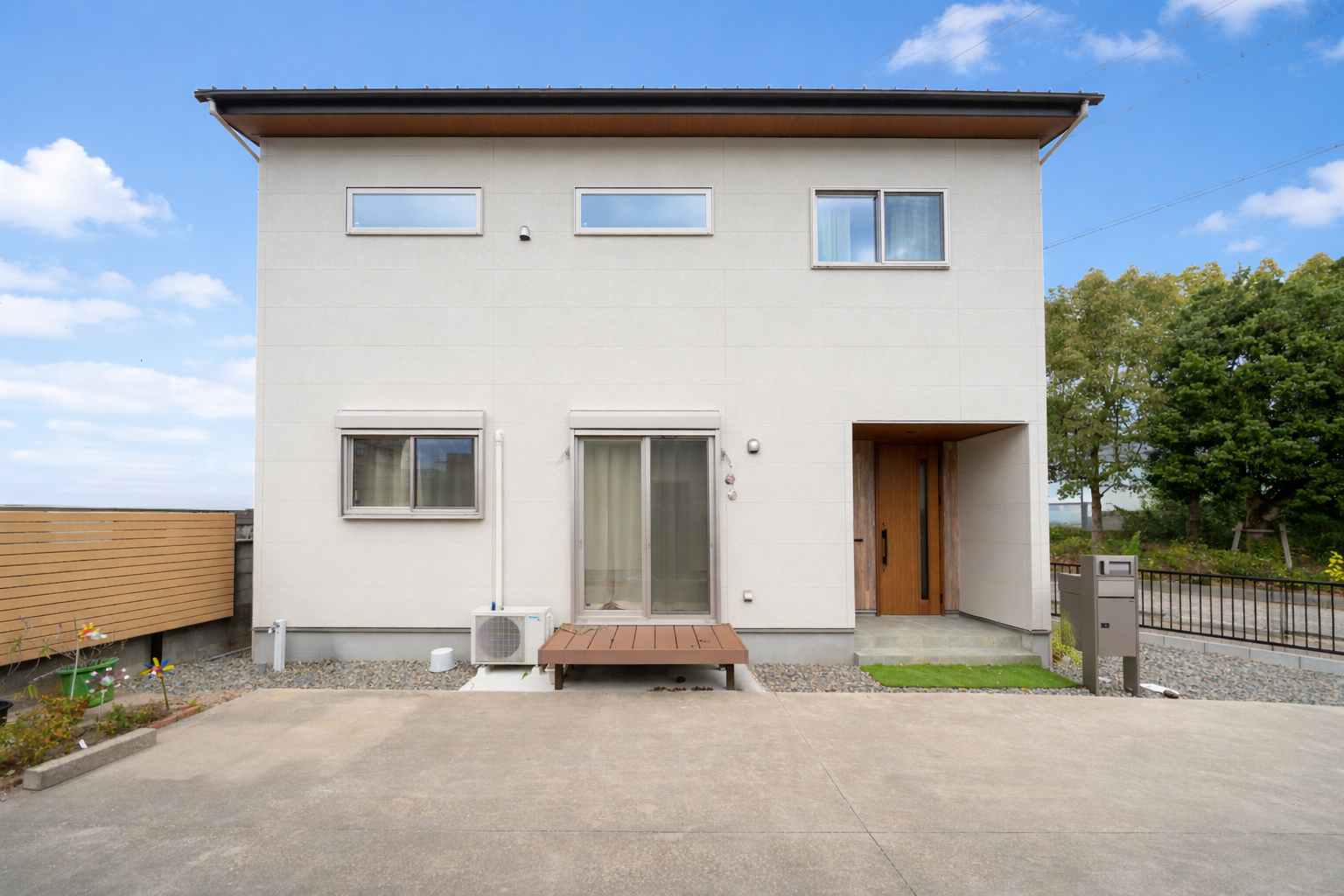 シンプルな箱型フォルムに、木の軒天がやさしく映える外観。