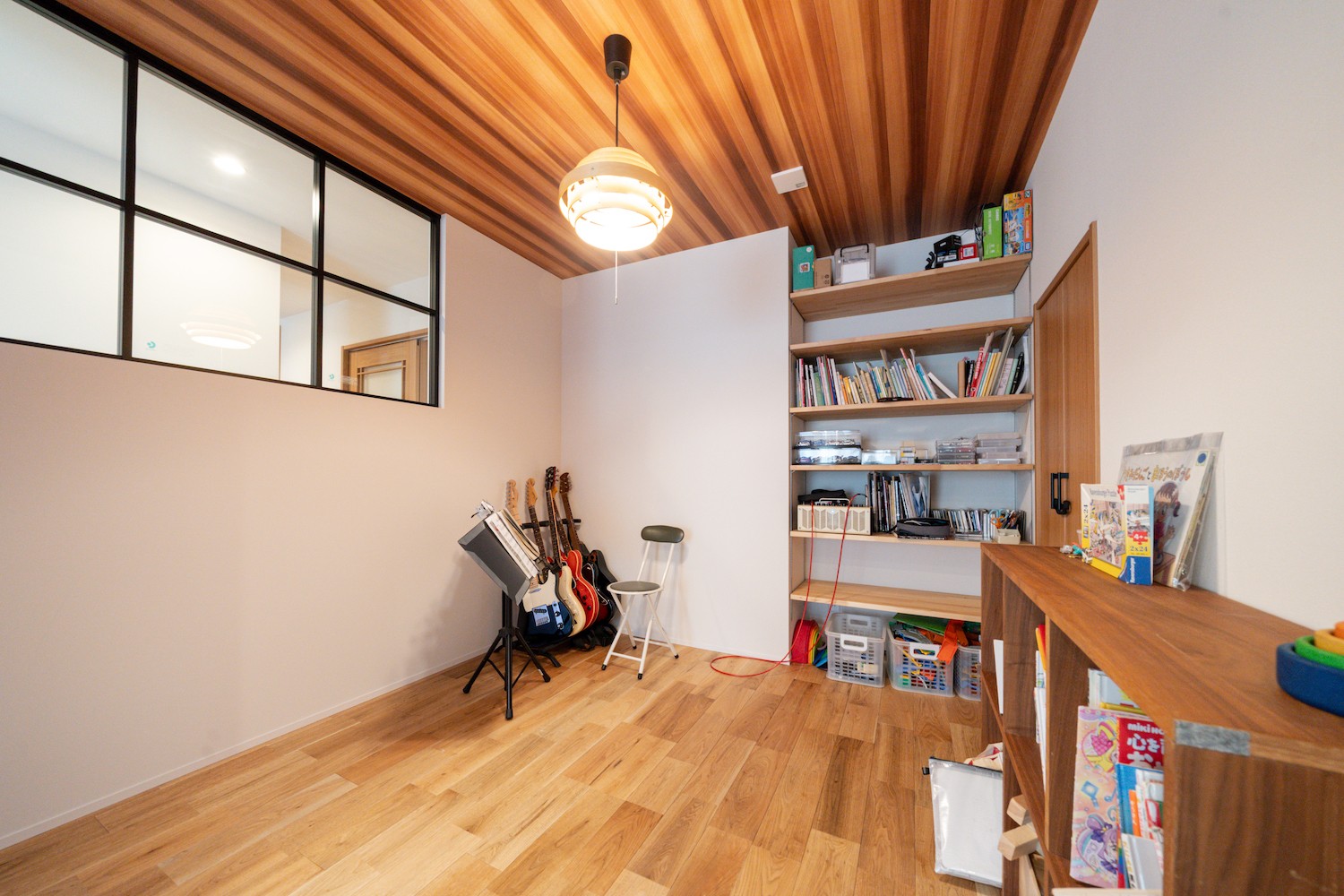 本棚や楽器置き場を備えた、