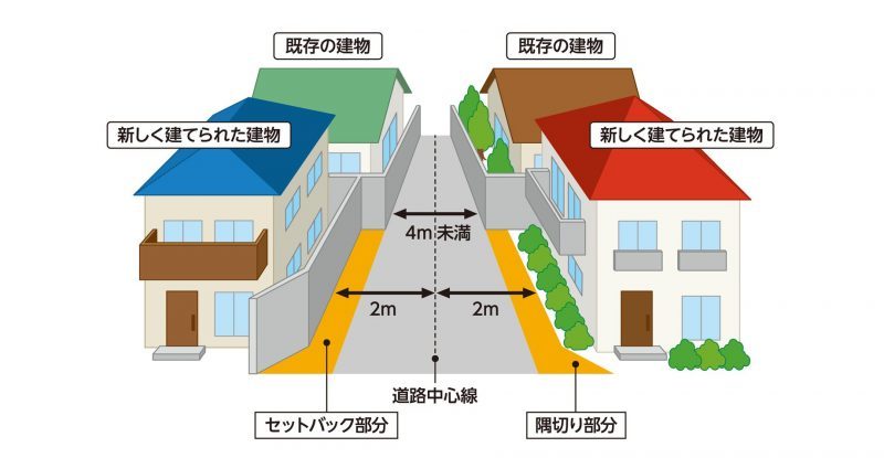 これを満たすため、幅4m未満の道路に面する土地ではセットバックが必要となります。