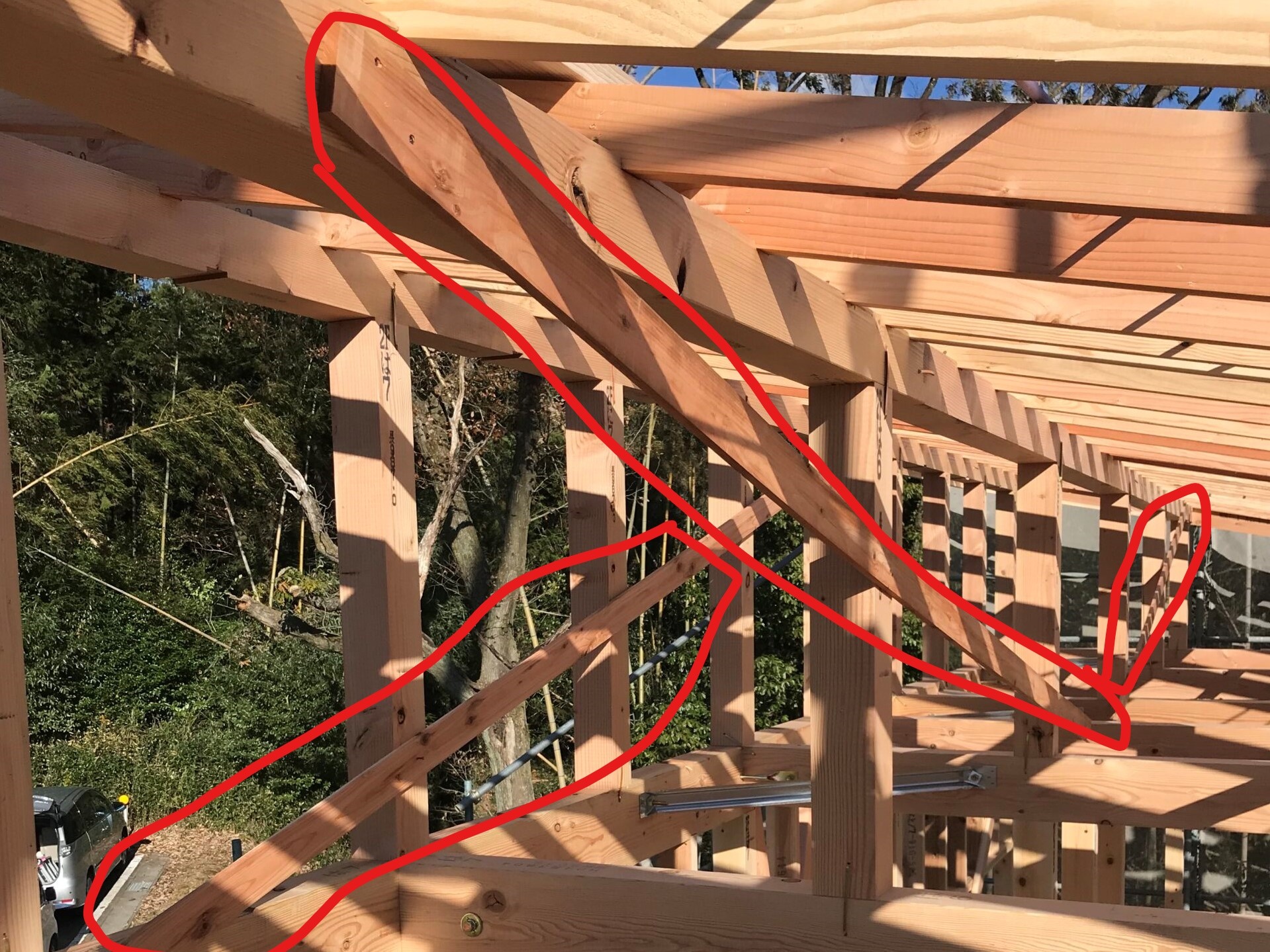 こちらの写真の赤く囲んだ部材がくも筋になります。