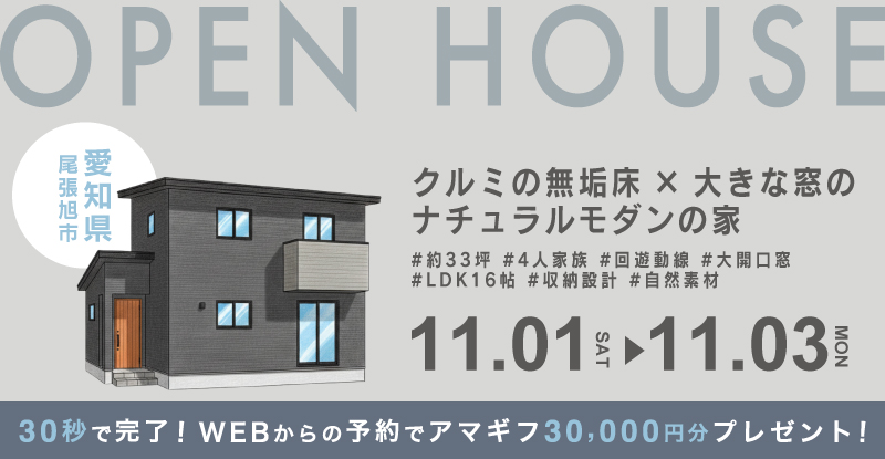 必須イベント名 【クルミの無垢床✕大きな窓のナチュラルモダンの家】完成見学会in尾張旭市