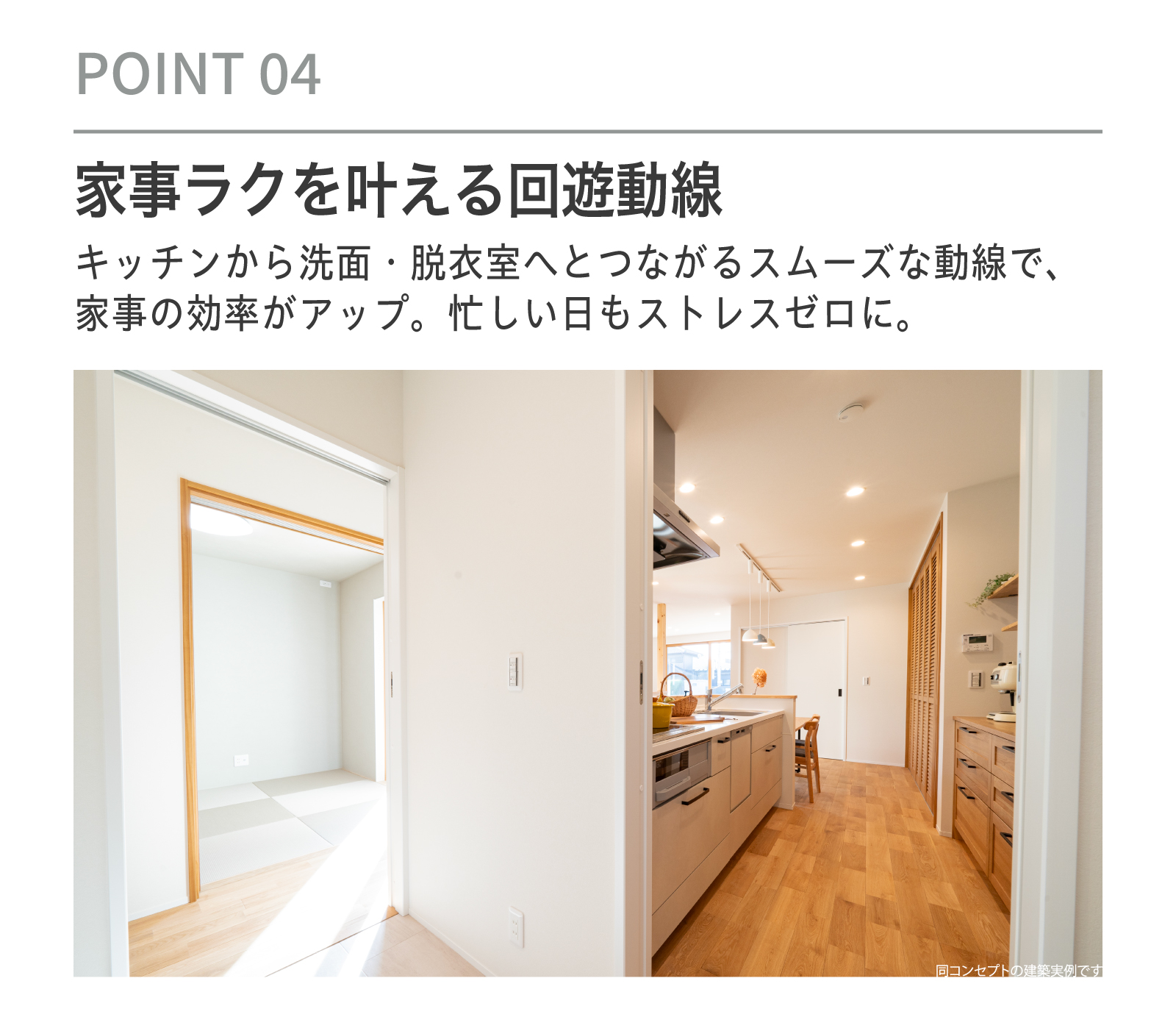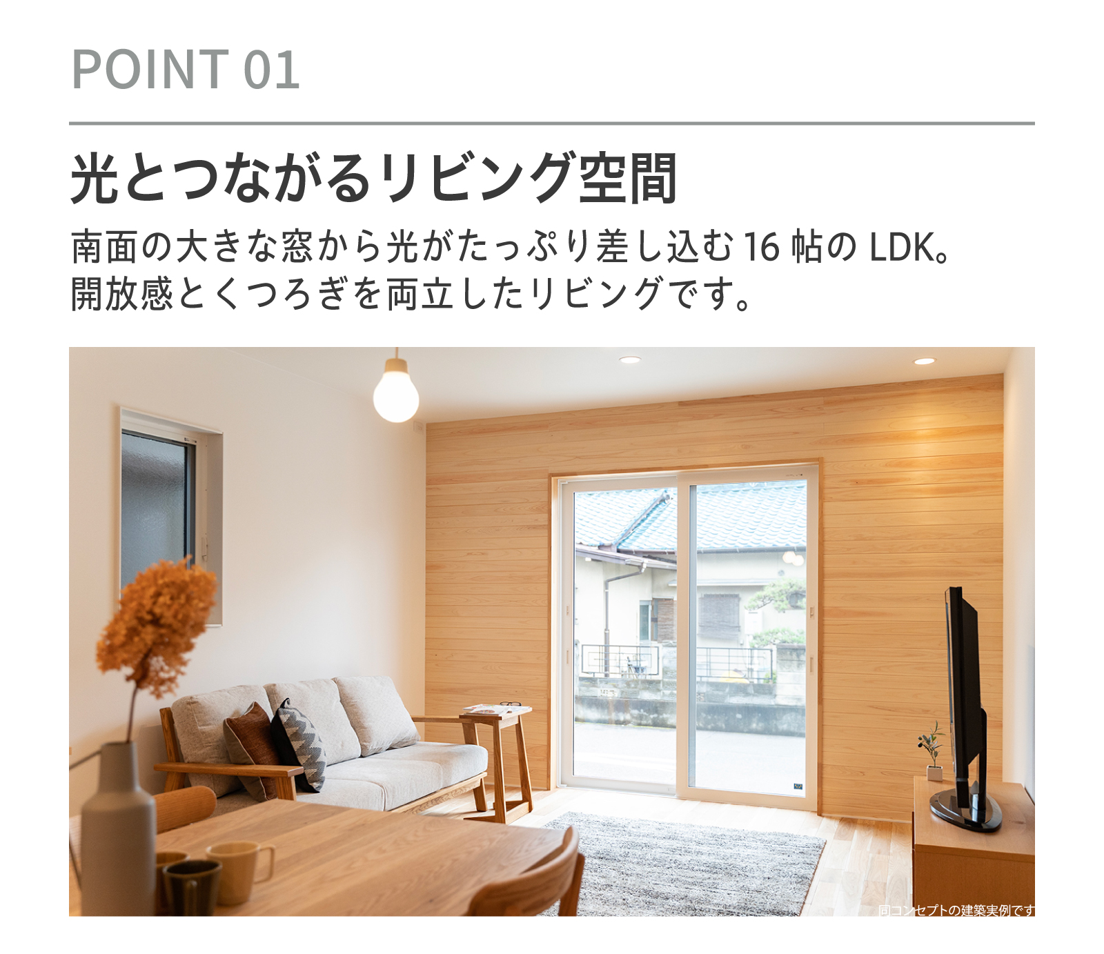 ご夫婦+お子さま2人の4人家族にぴったりな約33坪のお家。南向きリビングは光が心地よく、家族が自然と集まる空間です。クルミの無垢床がぬくもりを添え、回遊動線と豊富な収納で暮らしやすさも実現。