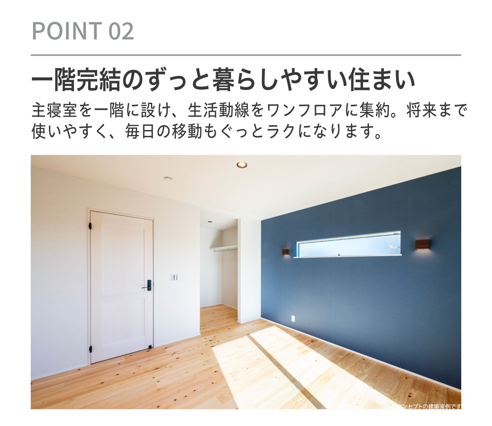 主寝室を一階に配置した一階完結の間取りで将来まで使いやすく、回遊動線や豊富な収納が毎日の生活をよりスムーズに。シンプルで上質な外観デザインと、家族思いの住まい心地を、ぜひ現地でご体感ください!