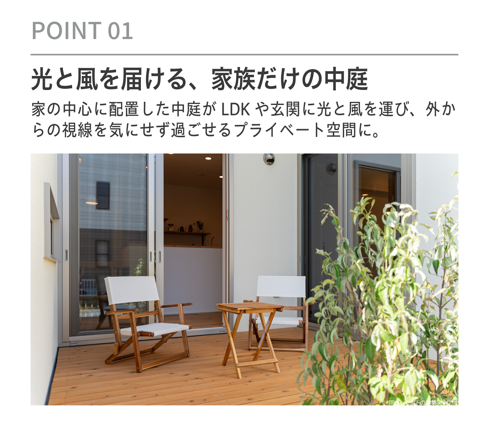 家の中心にある中庭から光が広がり、どこにいても明るく心地よい暮らしを叶えます。