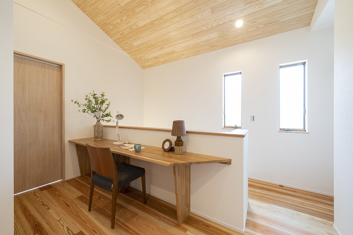 杉材の床、珪藻土の壁、杉板の天井が作り出す居心地の良い空間。