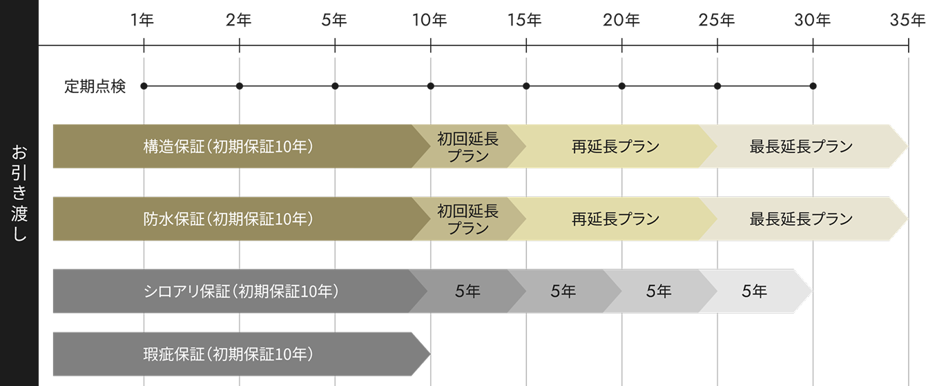 35年保証・定期点検・不同沈下保証で長く暮らしを支えます。