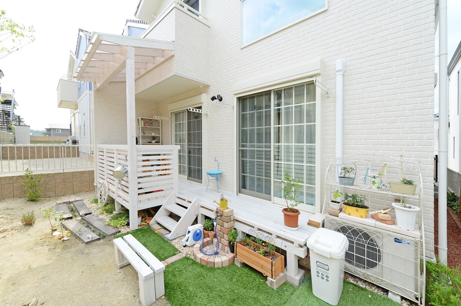 白いウッドデッキ、洋風な外観も随所にこだわりが。