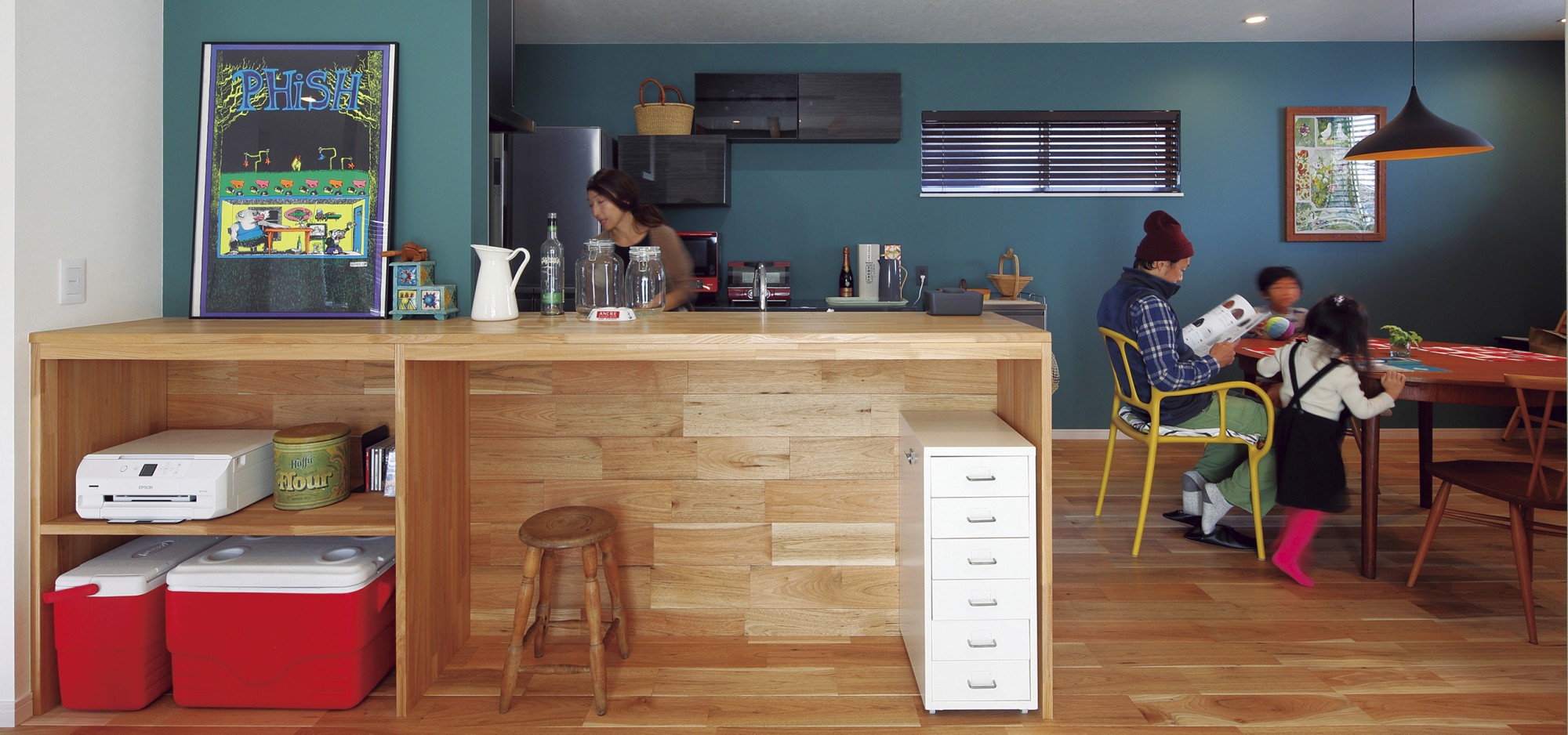 ウオルナットの床材×ブルー♪このお家のインテリアアクセントです。