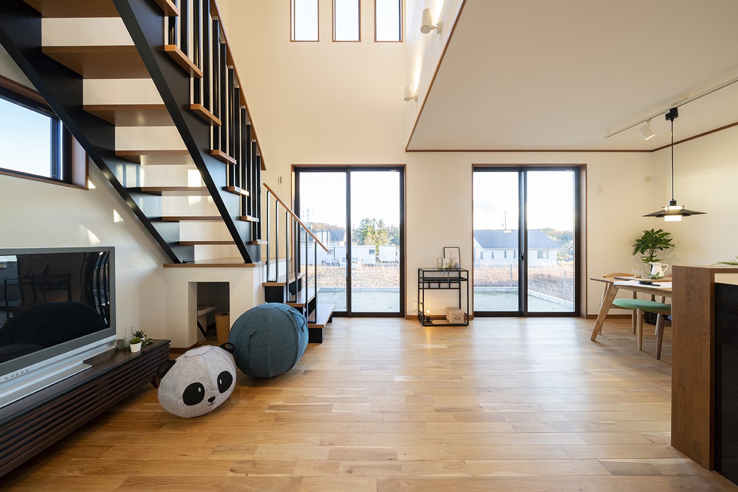 リビングにある吹き抜けは明るさと解放感を与えてくれます。黒のアイアンと木でできた階段がこのお家のインテリアアクセントになっています。