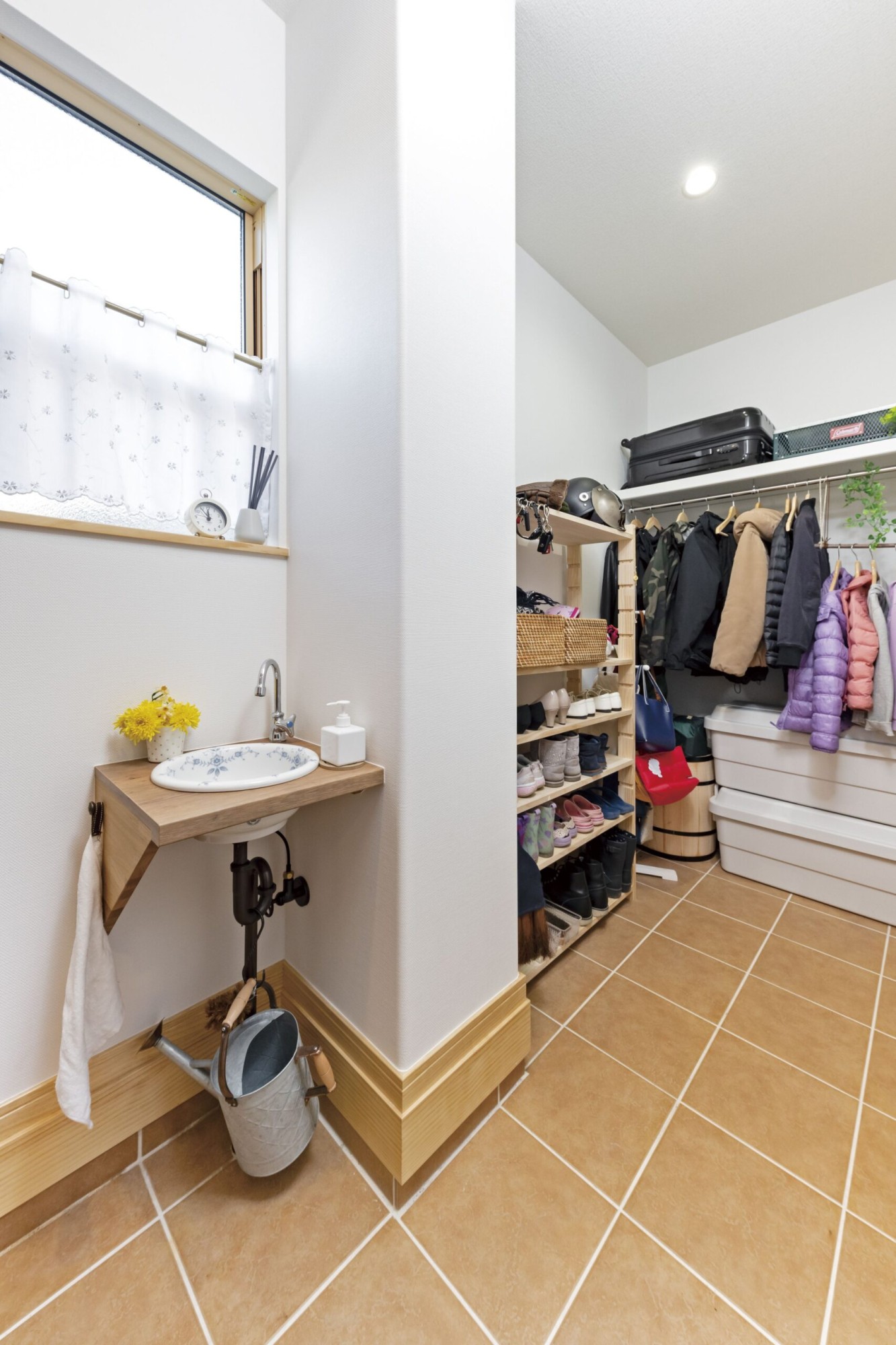 玄関に手洗いを設置。奥には収納部分を設け、帰宅後はここで身軽に・清潔に。