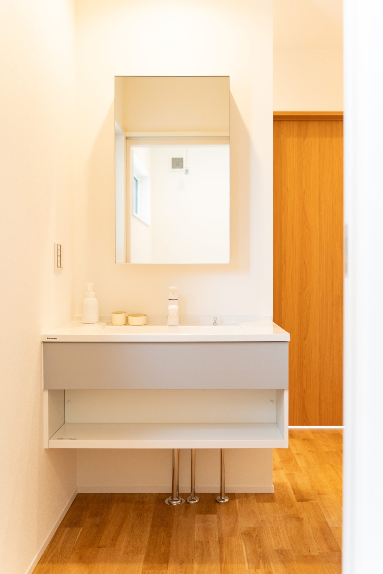 洗面はシンプルだけど鏡後ろも収納が出来る機能性に優れた空間です。
