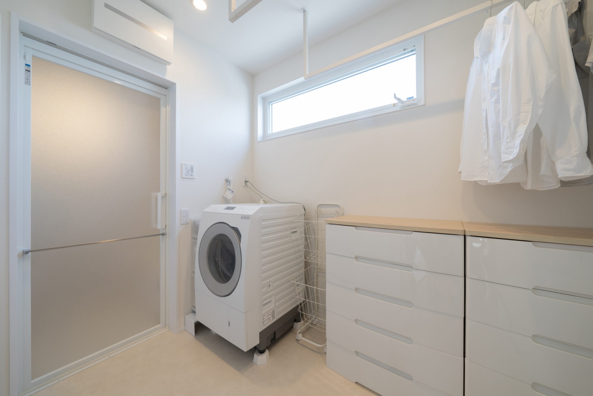 ランドリー兼脱衣室。洗濯して、干して、そのまま畳んでしまうことができます。