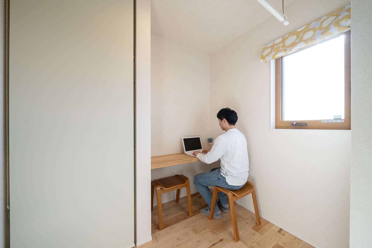 2階に上がった先のホールにはちょっとした書斎スペース。1階の家族が集まる空間とは別のため、在宅ワークや勉強など集中して取り組みたい時にはオススメです◎